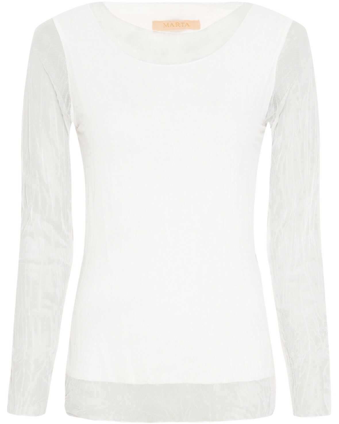 Top 1708 fra Marta Du Chateau i hvid. Flot mesh top med lange ærmer og ekstra lag på kroppen så det kun er ærmerne der er gennemsigtig.