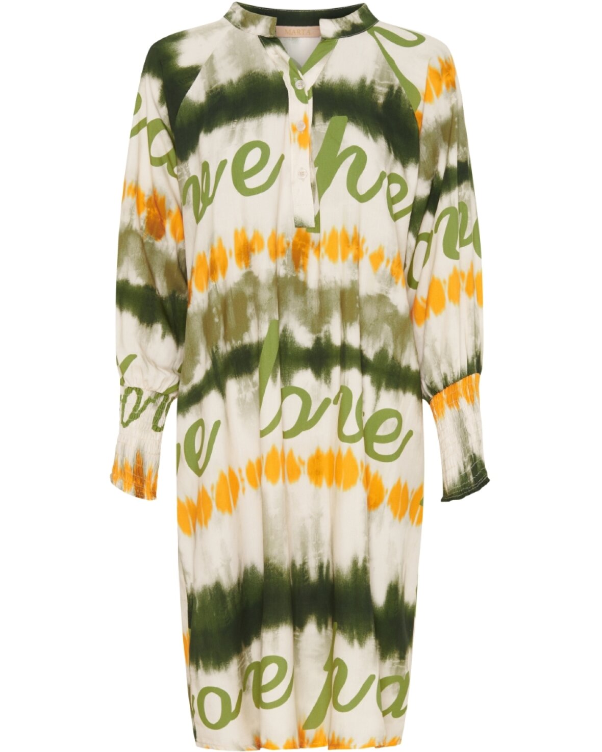Smuk kjole 5378 fra Marta Du Chateau i grøn med smukt farvespil i beige og gul. Den er med lange ærmer der slutter med smock. Den har knaplukning ned til under brystet som er omgivet af kalvekrøs. Smuk og lækker model at have på.