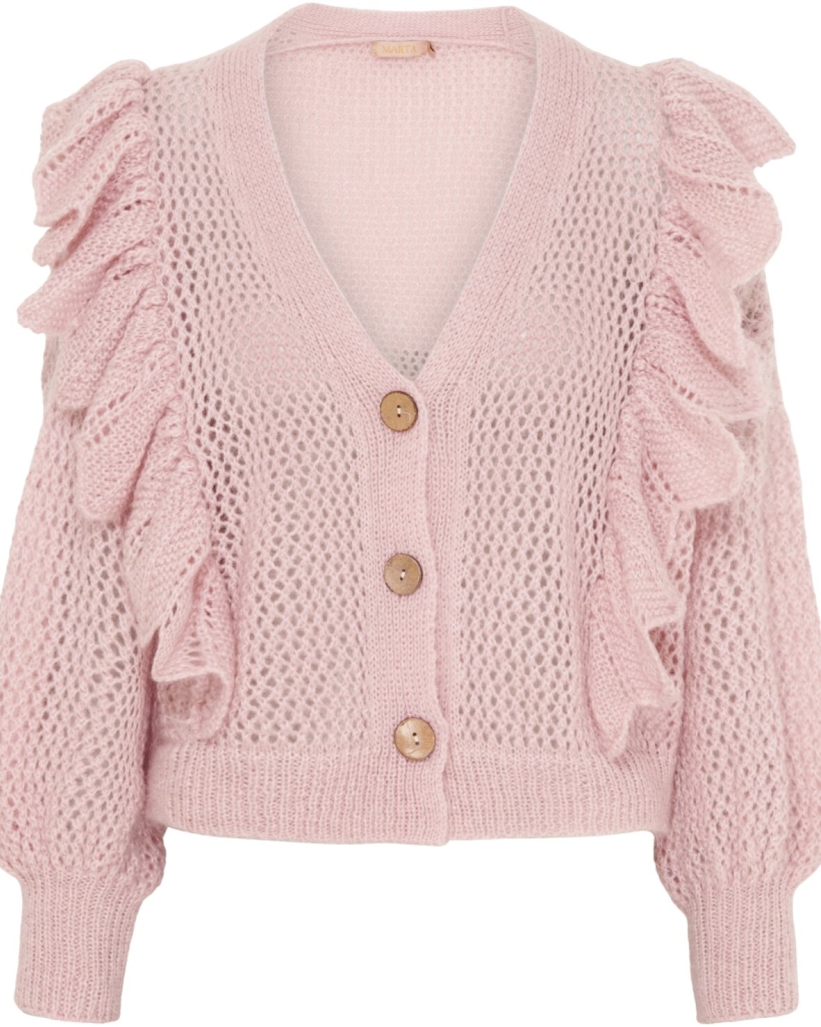 Strik 1522 fra Marta Du Chateau i rosa. Smuk cardigan med dyb v-udskæring, 3 "træ" knapper, lange ærmer og flæse foran.