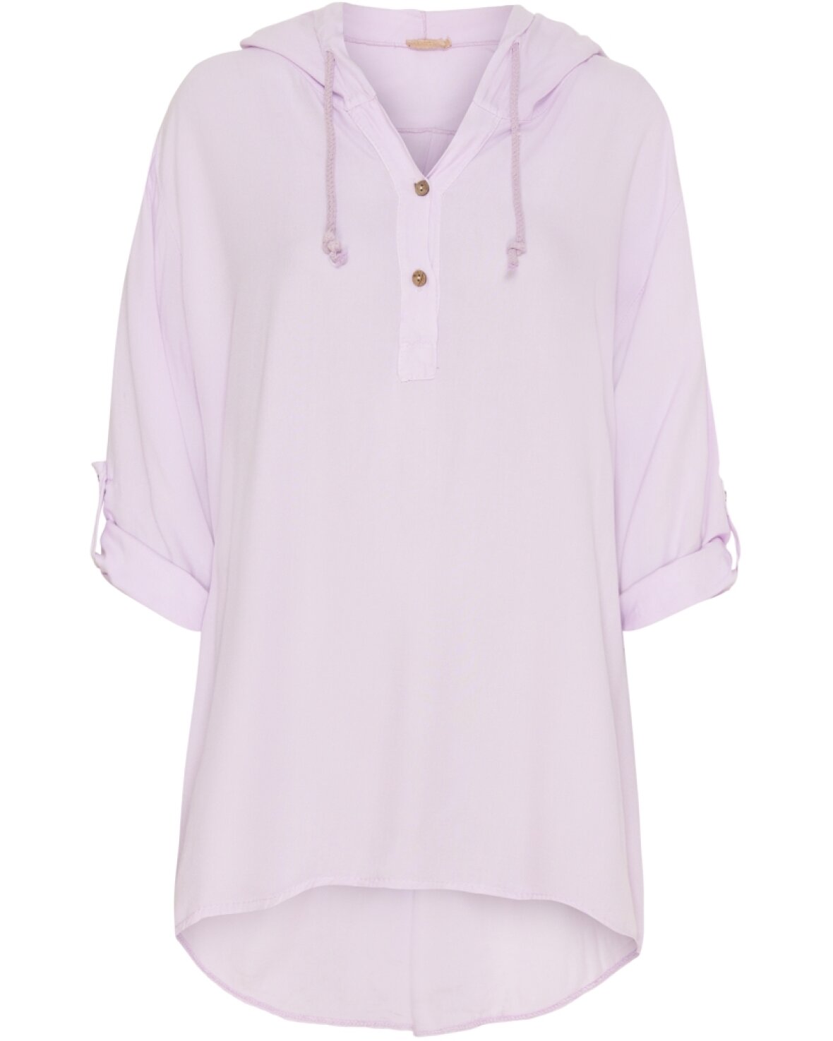 Den kendte tunika 31255 fra Marta Du Chateau i lavendel. Flot tunika med længde ned til midt på låret foran, lidt mere længde bagpå. Hætte med snøre og stolpelukning ned foran.