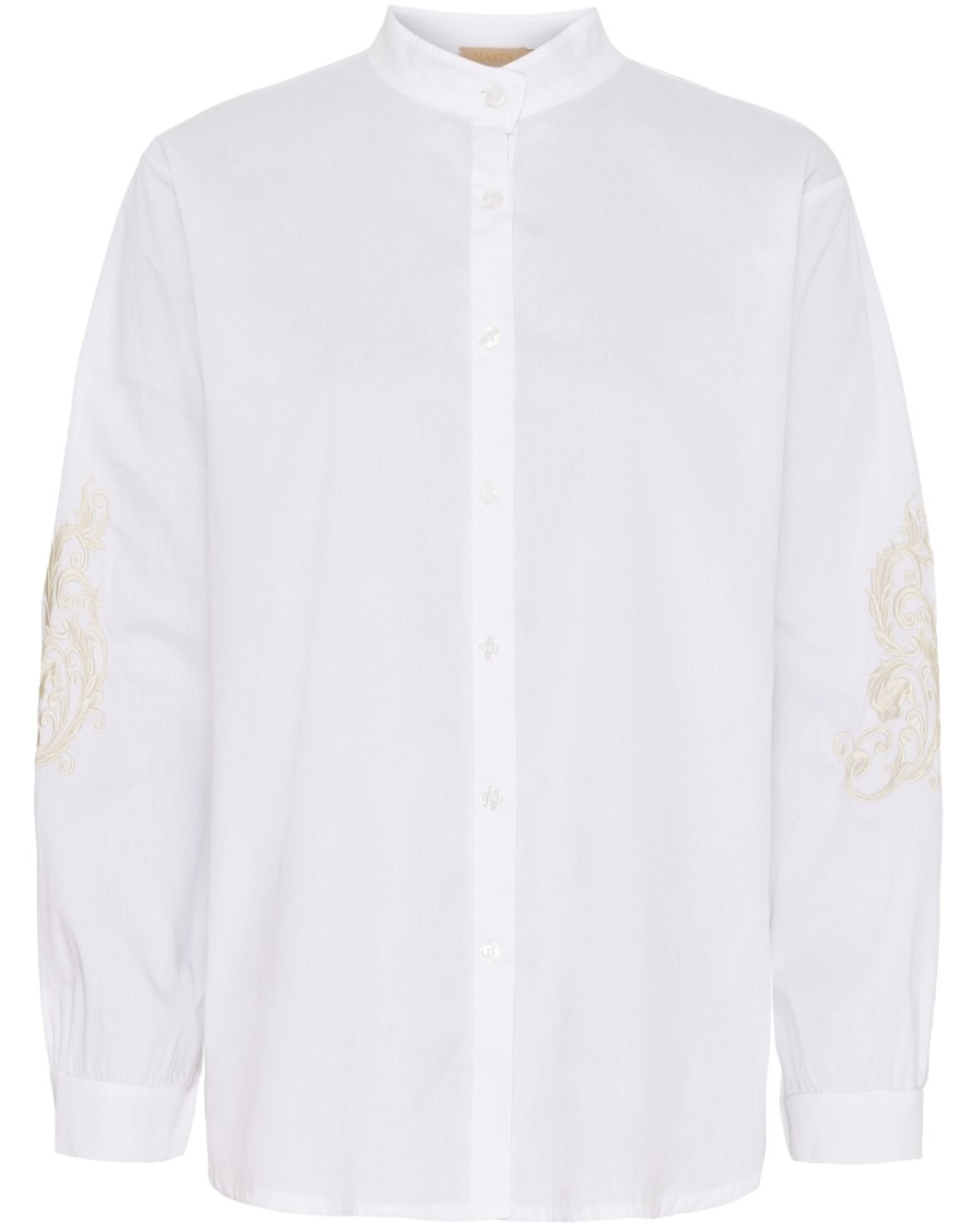 Skjorte 5534 fra Marta Du Chateau i hvid med fint beige broderi på hvert ærme. Skjorten er gennemknappet og med lange ærmer.