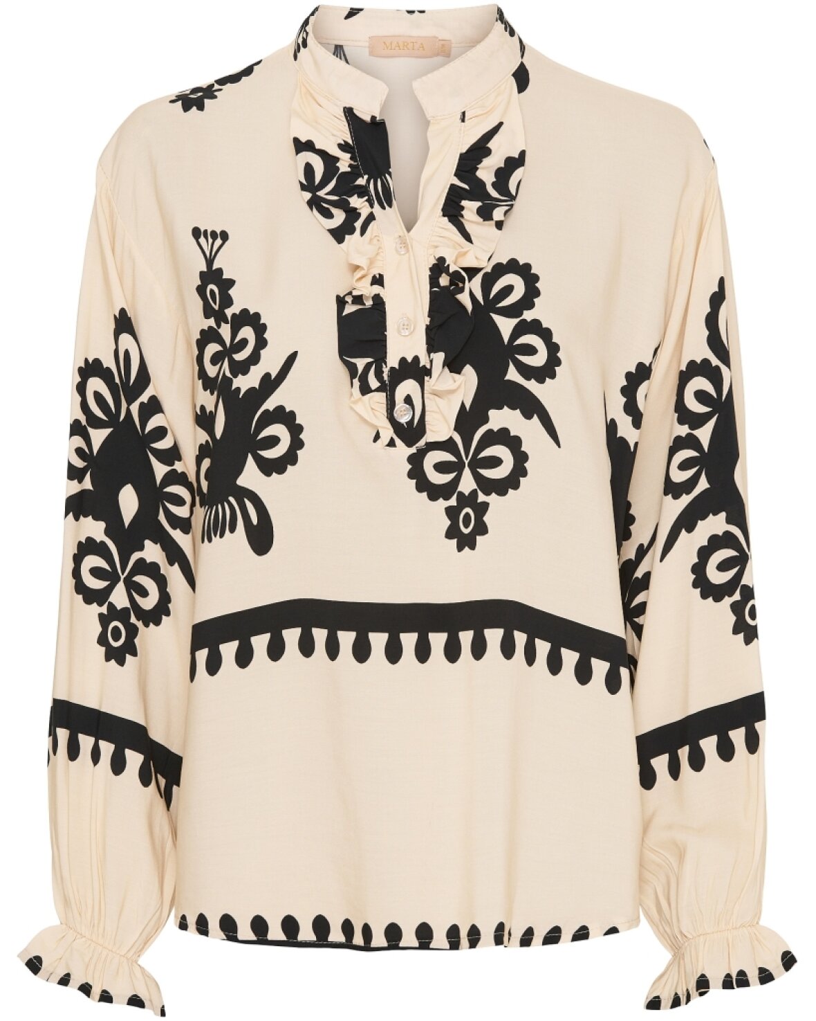 Skjorte 5891 fra Marta Du Chateau i beige. Smuk skjorte med sød krave, kalvekrøs ned ved knapperne. Lange ærmer der slutter med elastik og lille flæse detalje.
