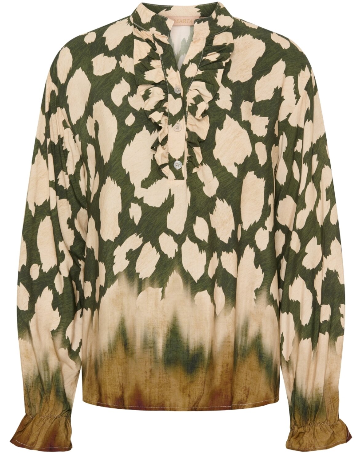 Skjorte 5891 fra Marta Du Chateau i grøn. Smuk skjorte med kina krave, kalvekrøs ned ved knapperne. Lange ærmer der slutter med elastik og lille flæse detalje.