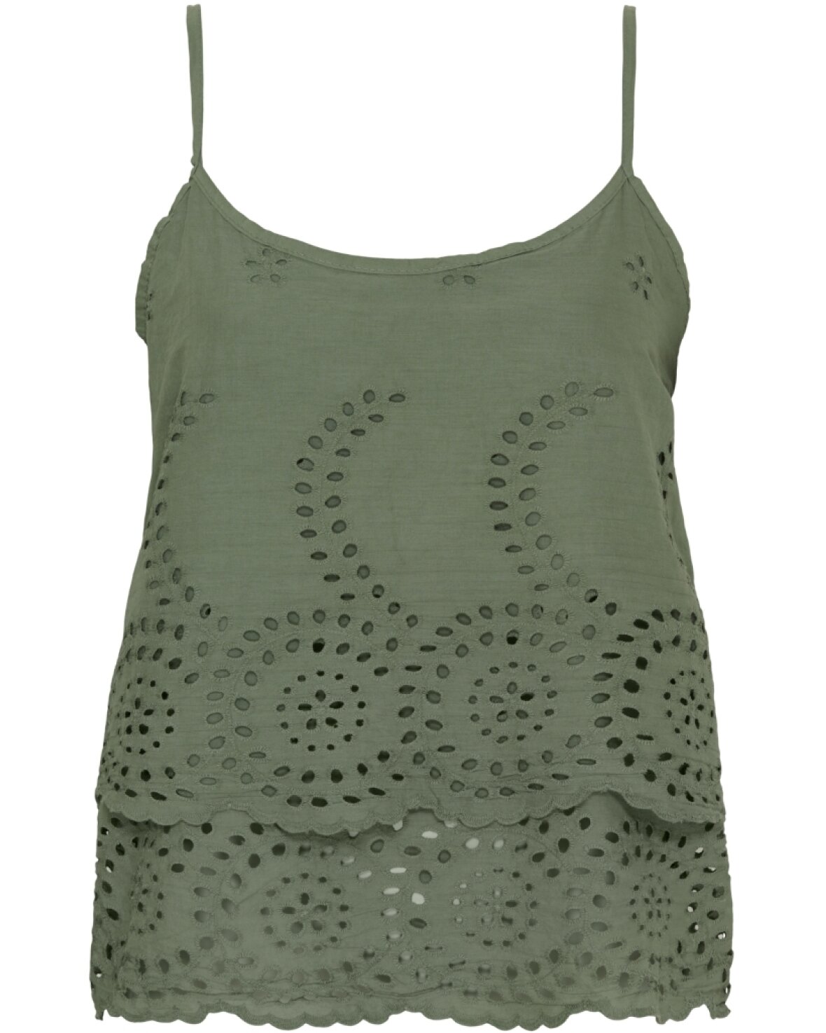 Top 5720 fra Marta Du Chateau i grøn. Skøn top med tynde stropper og smukt broderi anglaise. Toppen kommer i lag, har en fin længde. Bagpå med elastik for bedre pasform.