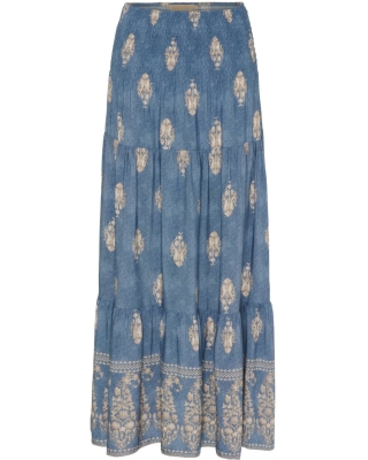 Nederdel 24107 fra Marta Du Chateau i blå med fint påtrykt mønster i creme. Nederdelen har 15 cm smock i livet, hvilket gør at den kan sættes hvor den sidder bedst. Smuk nederdel der falder flot på.