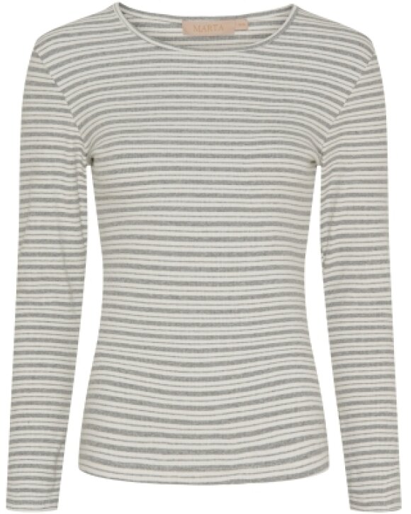 T-shirt 6452 fra Marta Du Chateau creme med grå striber. T-shirt'en har rund hals og lange ærmer. Modellen her, fungere fint for sig selv, men også god under skjorter, strik eller kjoler.