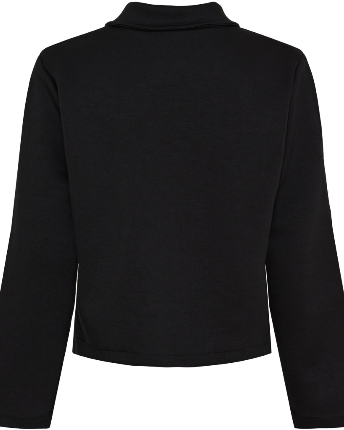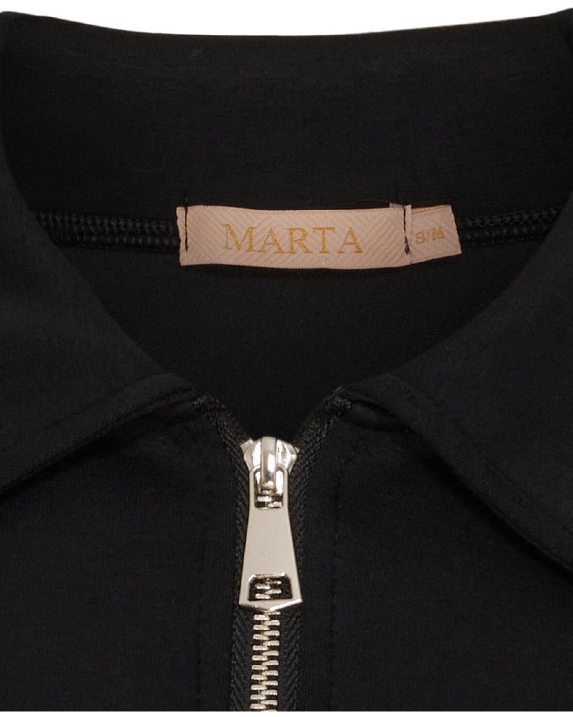 Cardigan 35530 fra Marta Du Chateau i sort med hvid piping ned på ærmet. Den lukkes med lynlås og har klassisk krave.