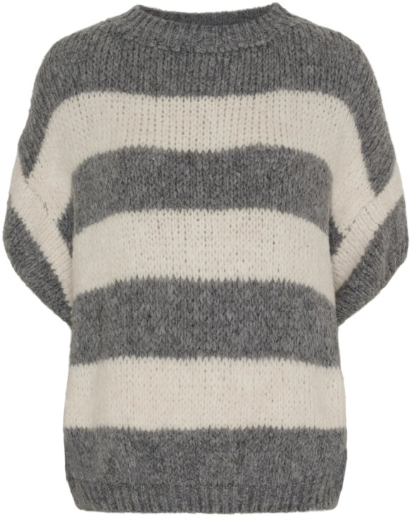 Strik 2479 fra Marta Du Chateau i grå med hvide striber. Skøn strik med let oversize/ blød facon og korte ærmer.