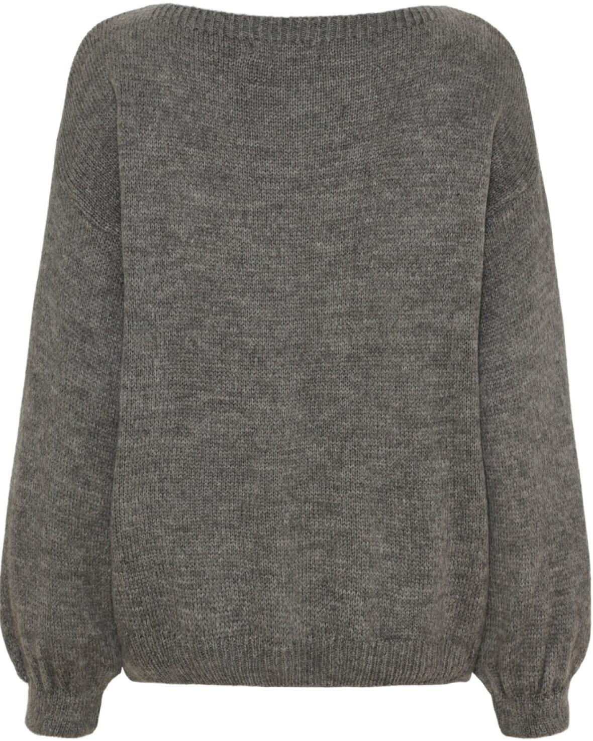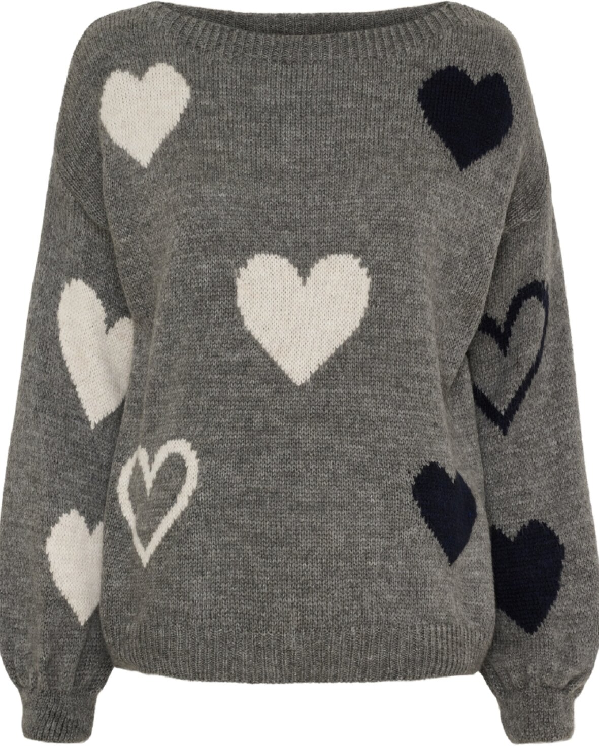 Strik 64023 fra Marta Du Chateau i grå med hjerte på. Skøn strik med båd hals, lange ærmer og skøn at have på.
