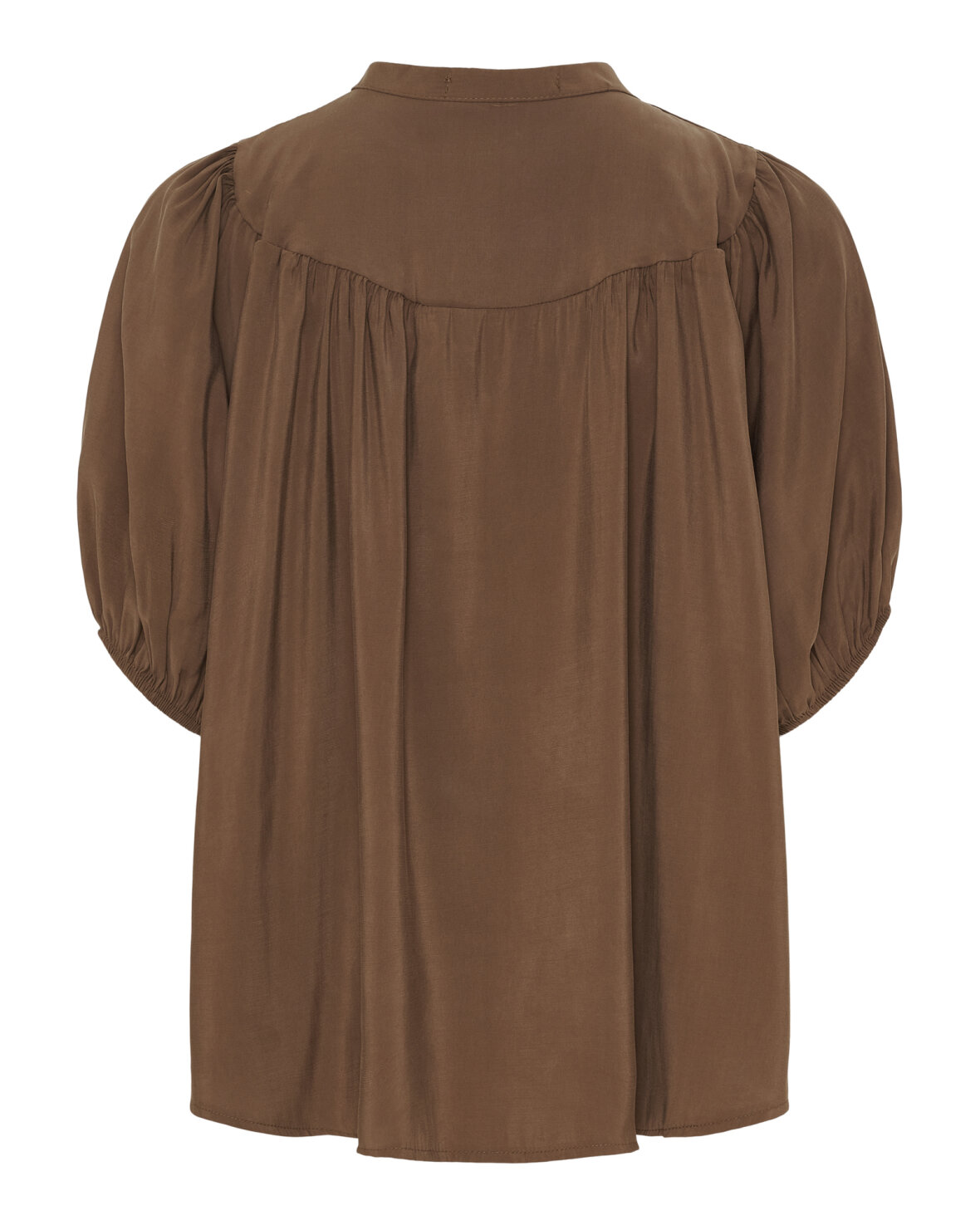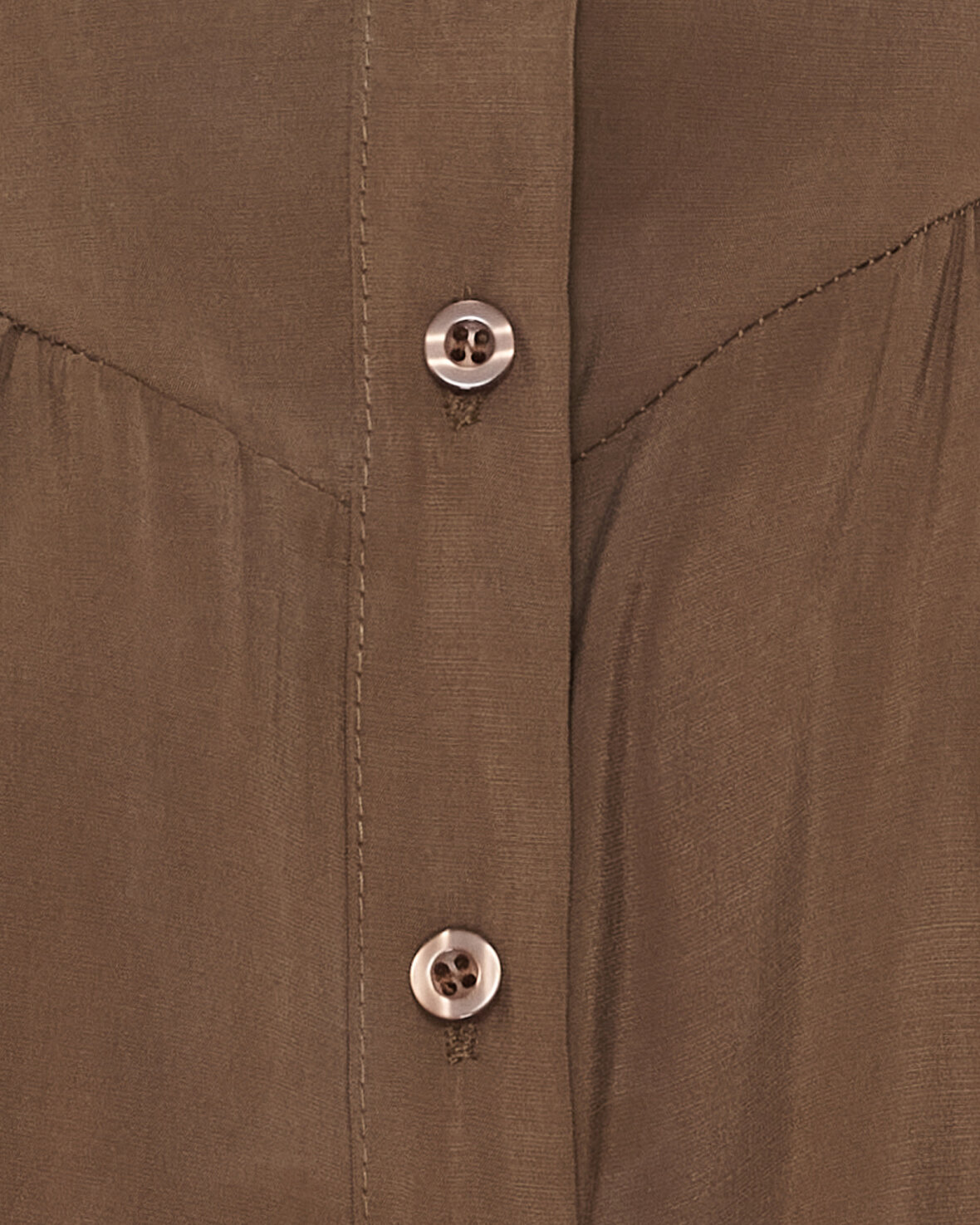 Bluse 58210 fra Marta Du Chateau i brun. Smuk skjorte med kina krave, gennemknappet og et fint ærme. Sød rynkedetalje hen over brystet.