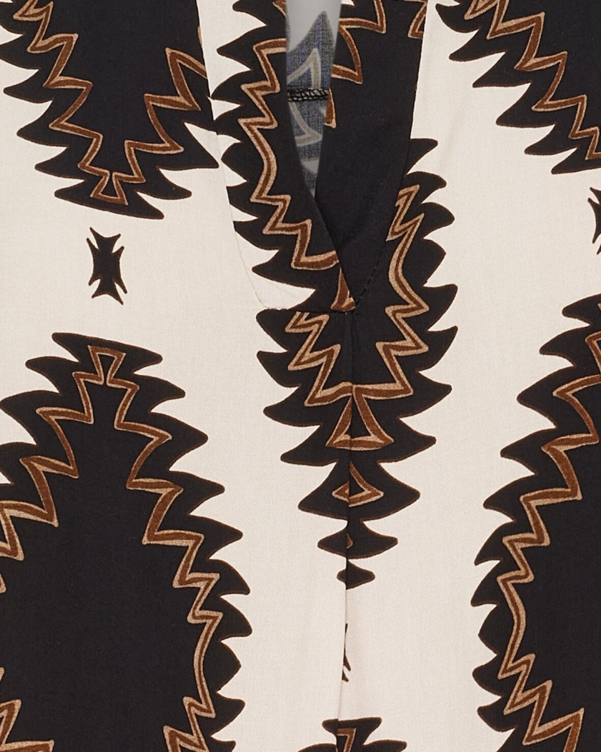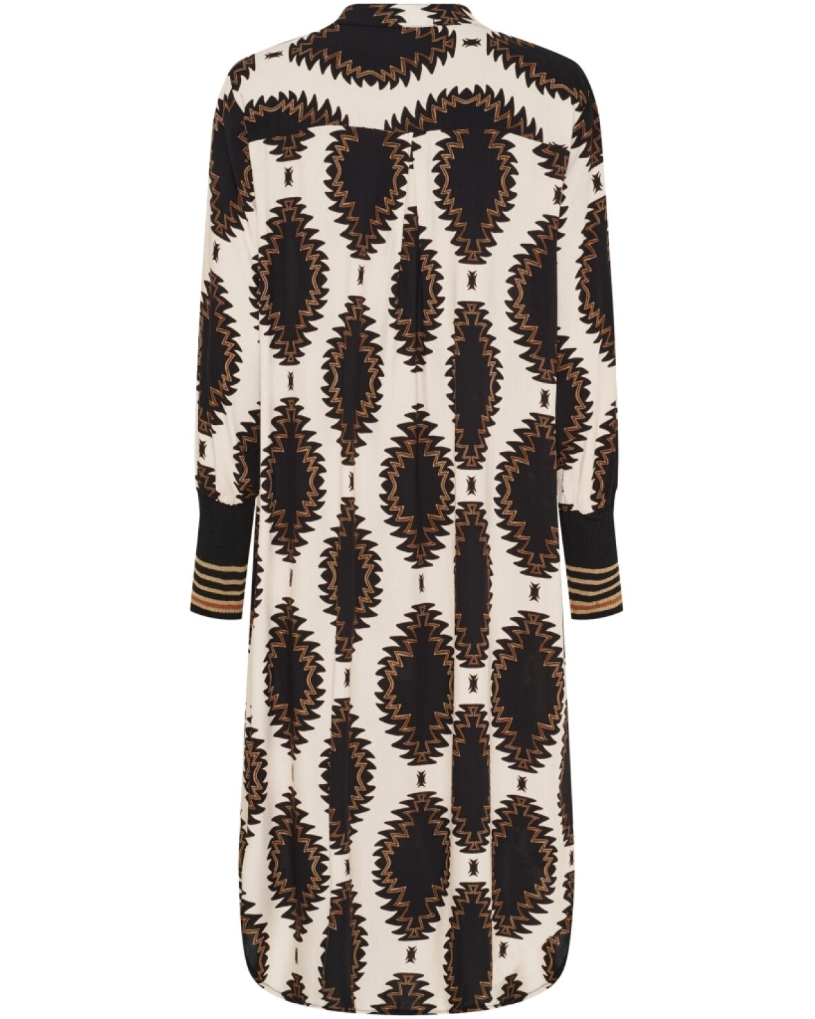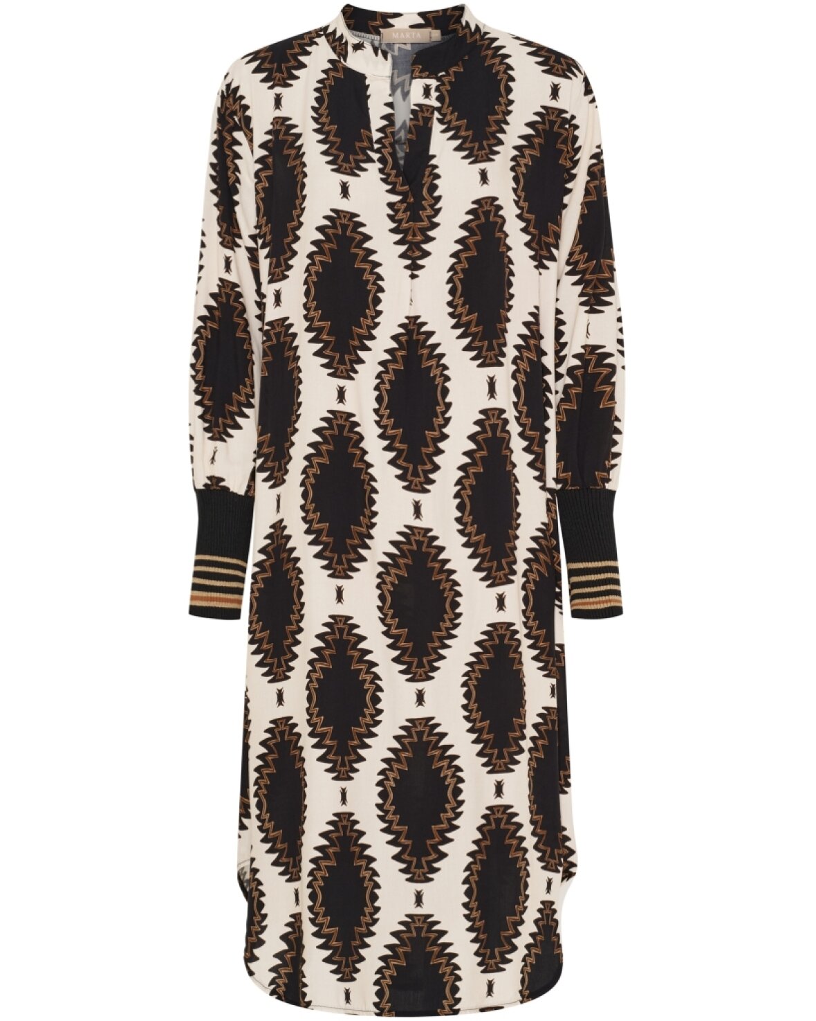Kjole 25230 fra Marta Du Chateau i creme med sort og brunt mønster. Virkelig smuk kjole med v udskæring, lange ærmer med flot ribkant.