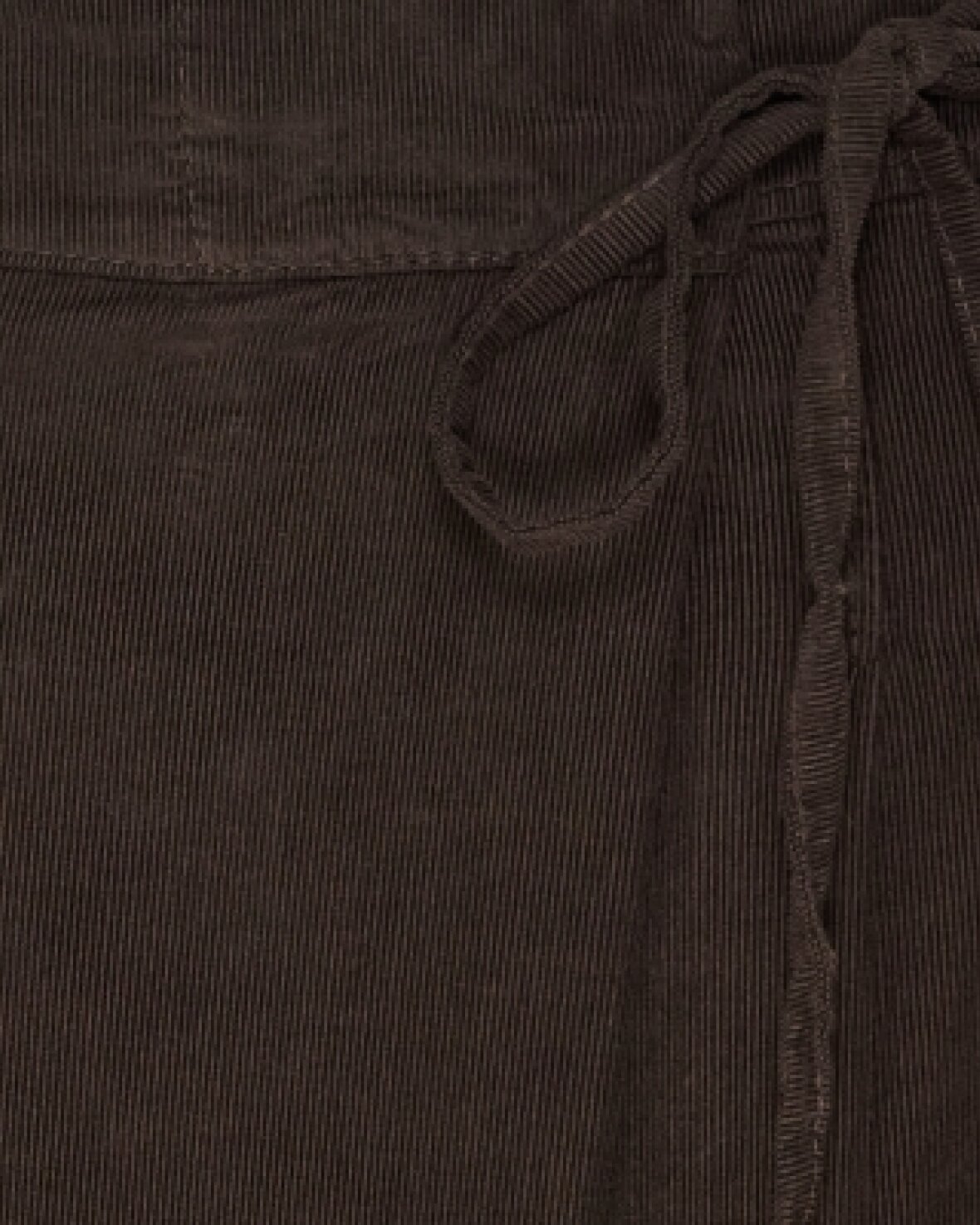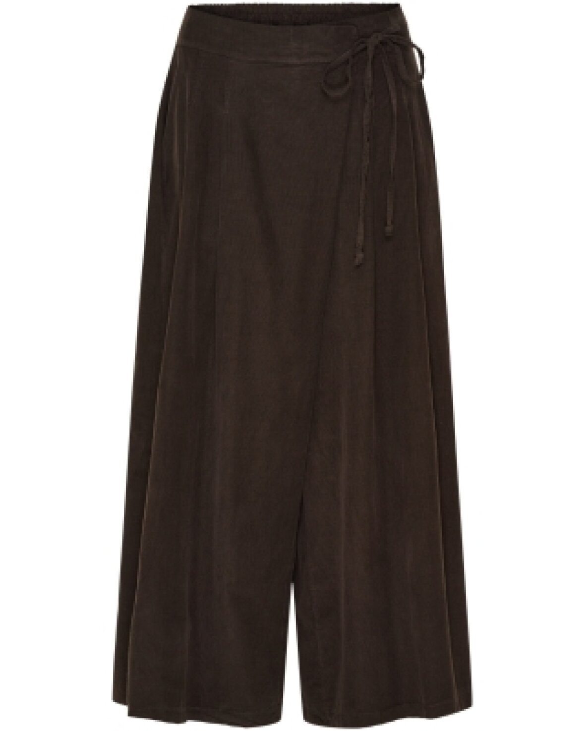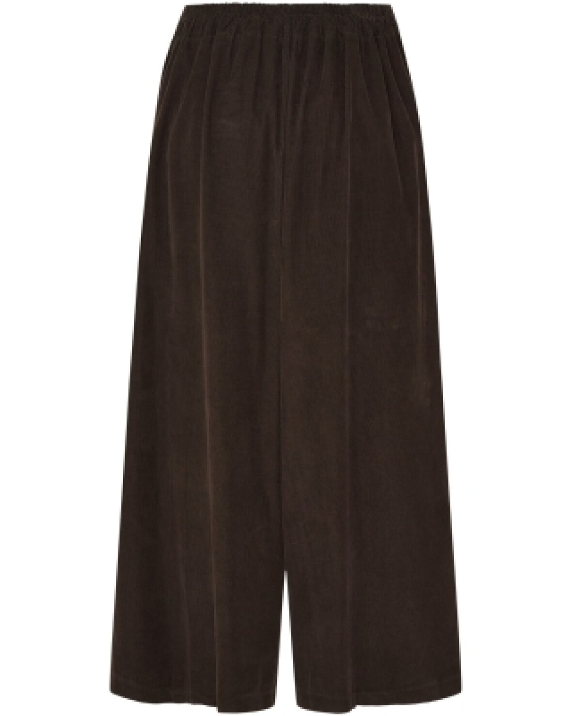 Buks 256244-3 fra Marta Du Chateau i brun baby fløjl. Stumpende vidde buks med sød binde detalje i livet. Skøn vidde buks der både fungere godt med sandaler og støvler. Buksen har fast linning foran og elastik bagpå, hvilket gør at buksen sidder fantastisk på.