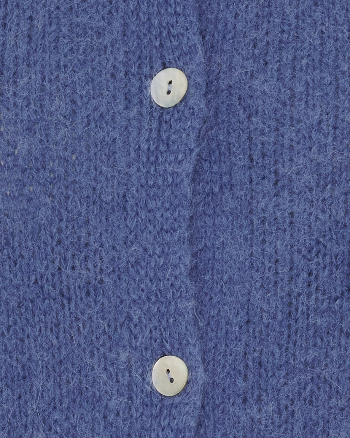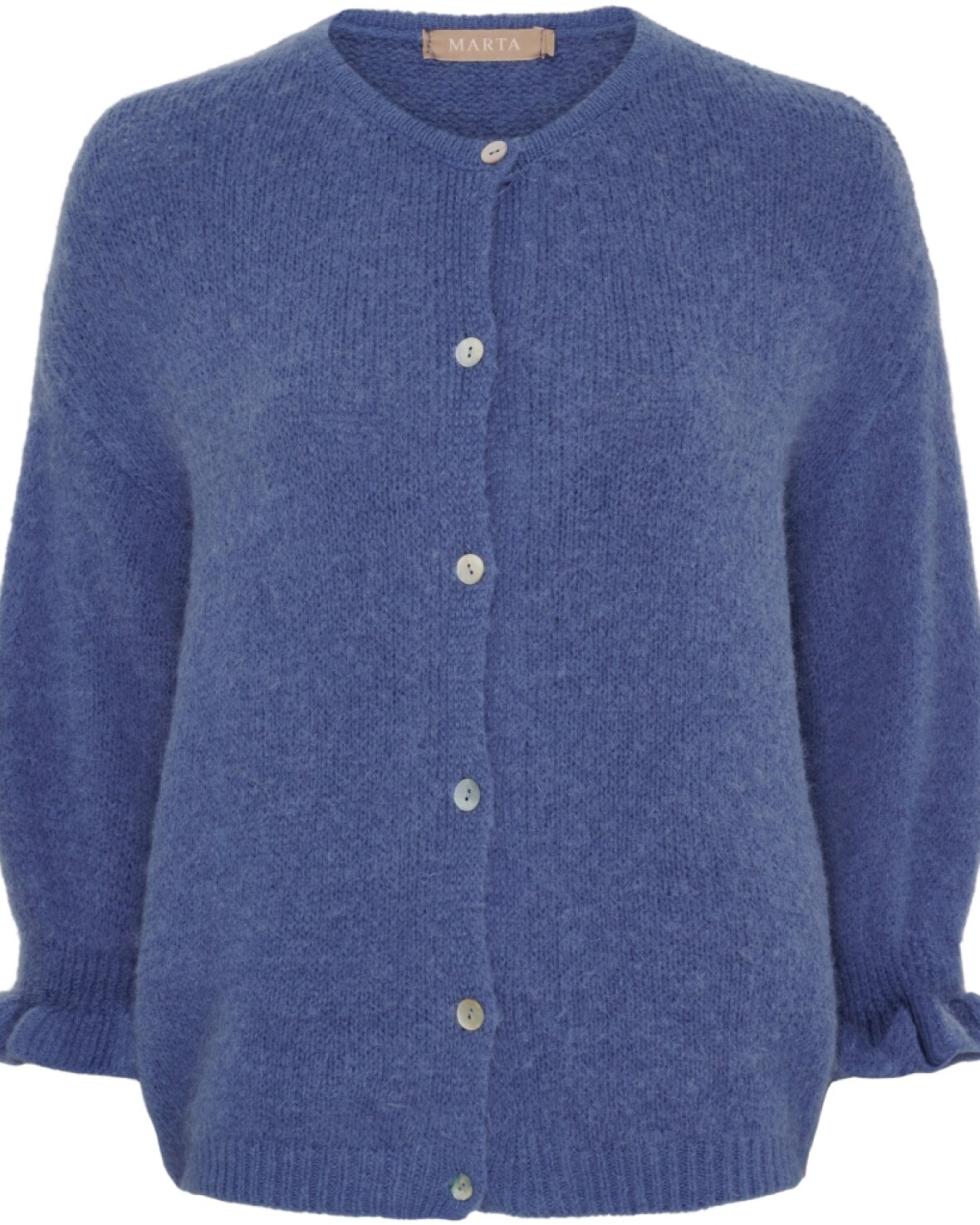 Strik 2413 fra Marta Du Chateau i jeans blå. Lækreste strik cardigan med rund hals, gennemknappet og 3/4 lange ærmer med fin "flæse" detalje