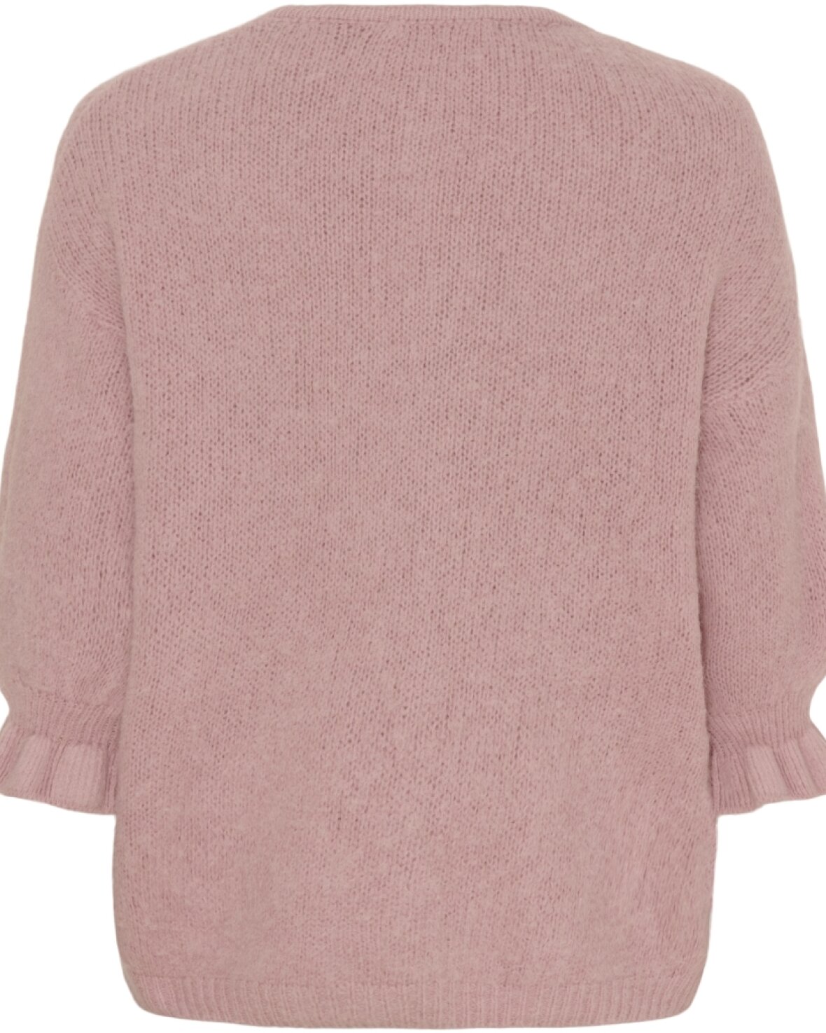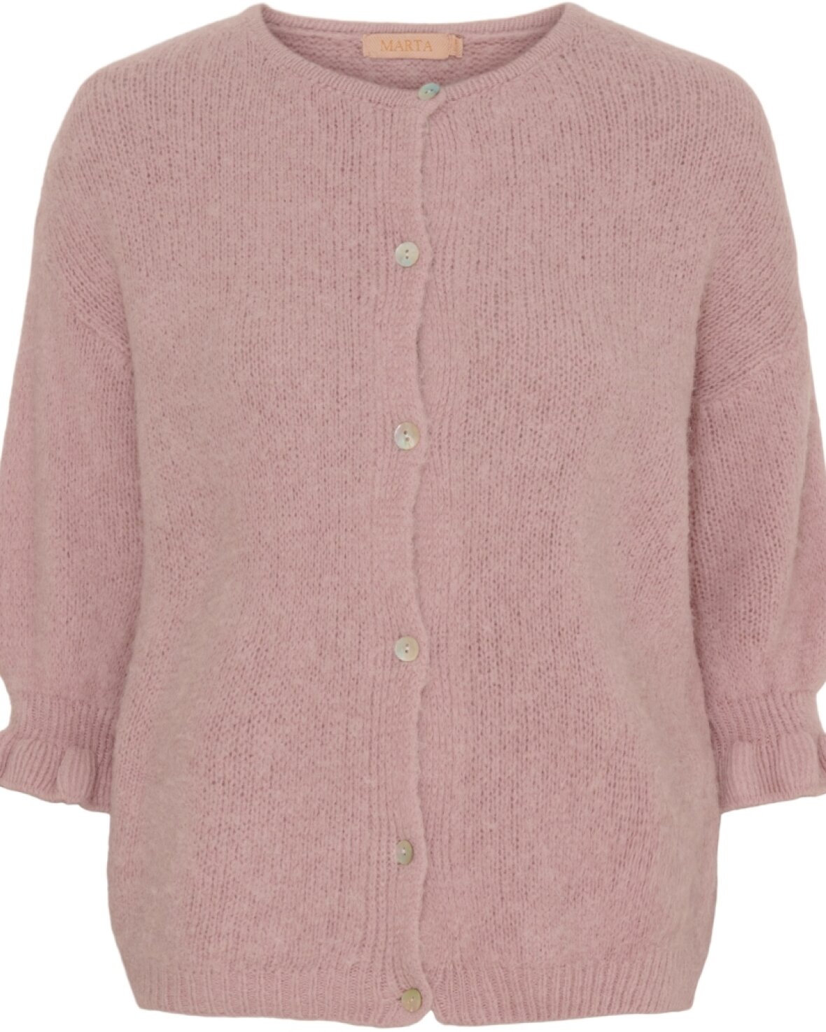 Strik 2413 fra Marta Du Chateau i gammelrosa. Lækreste strik cardigan med rund hals, gennemknappet og 3/4 lange ærmer med fin "flæse" detalje