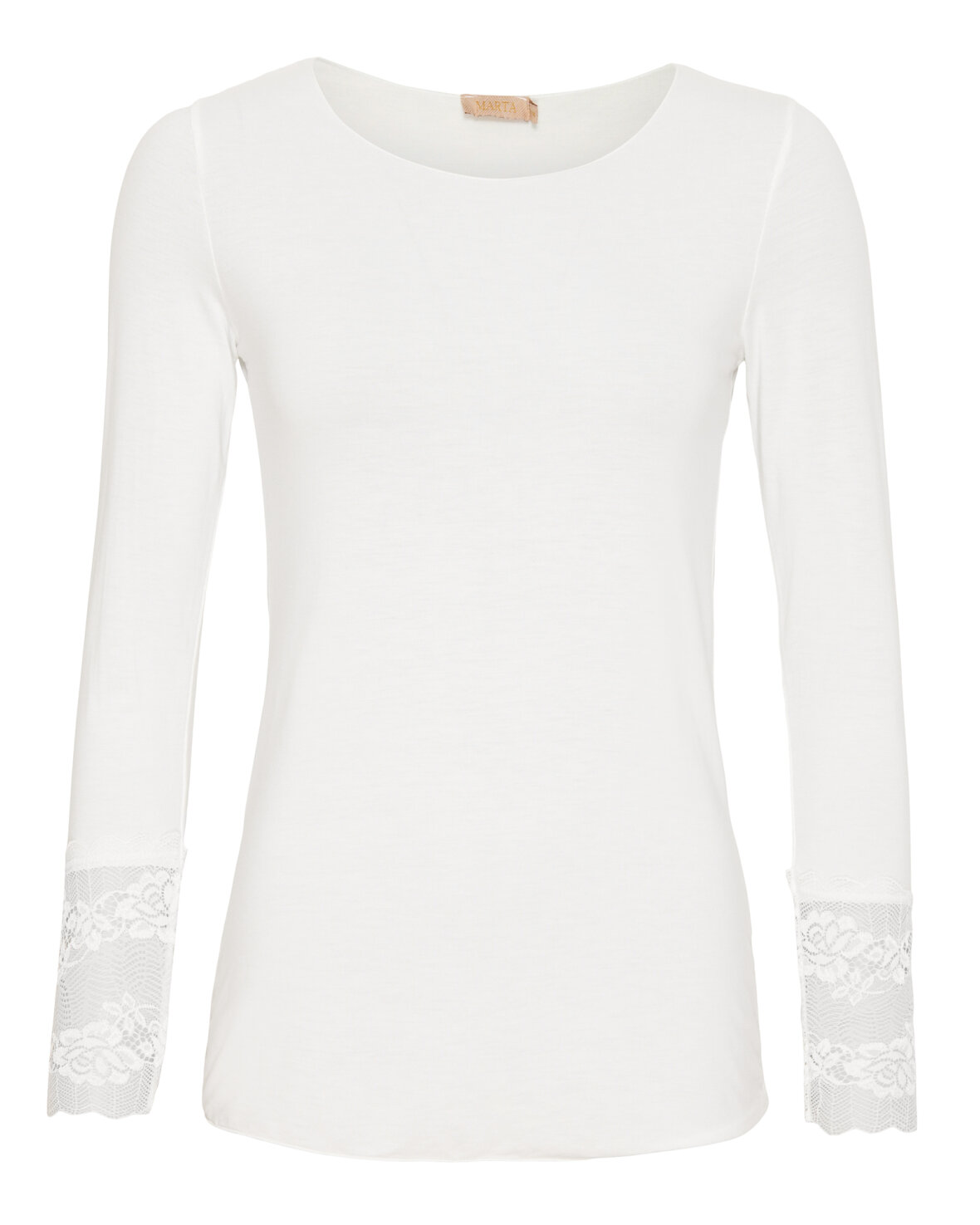 T-shirt 11297 fra Marta Du Chateau i hvid. Klassisk t-shirt med lange ærmer, hvor det nederste stykke er med den smukkeste blonde. Den har rund hals udskæring og er lækker og behagelig at have på.