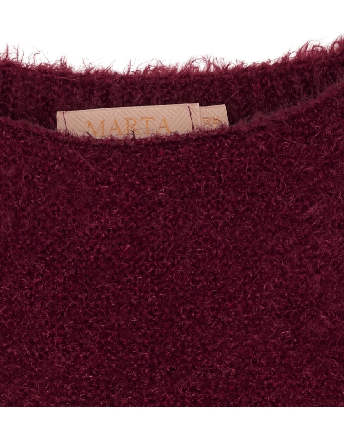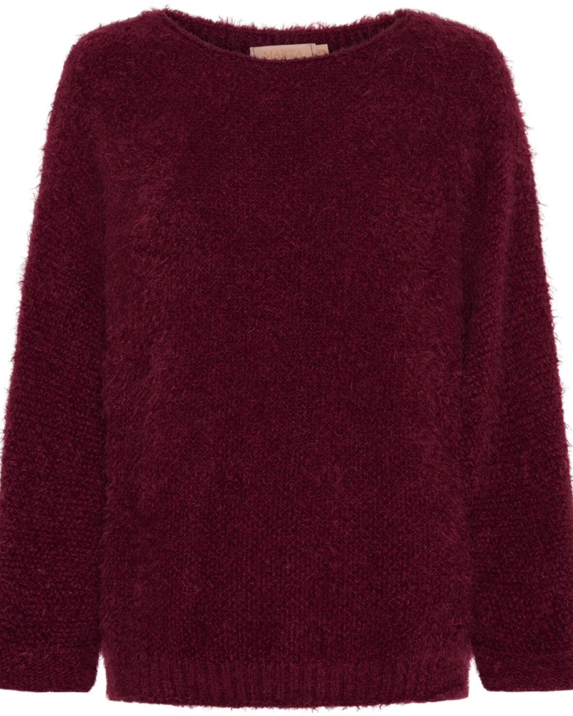 Strik 8038 fra Marta Du Chateau i wine. Vamset og lækker blød strikketrøje. Strikketrøjen har rund hals og let stumpende ærme, smuk med blonde eller mesh under.
