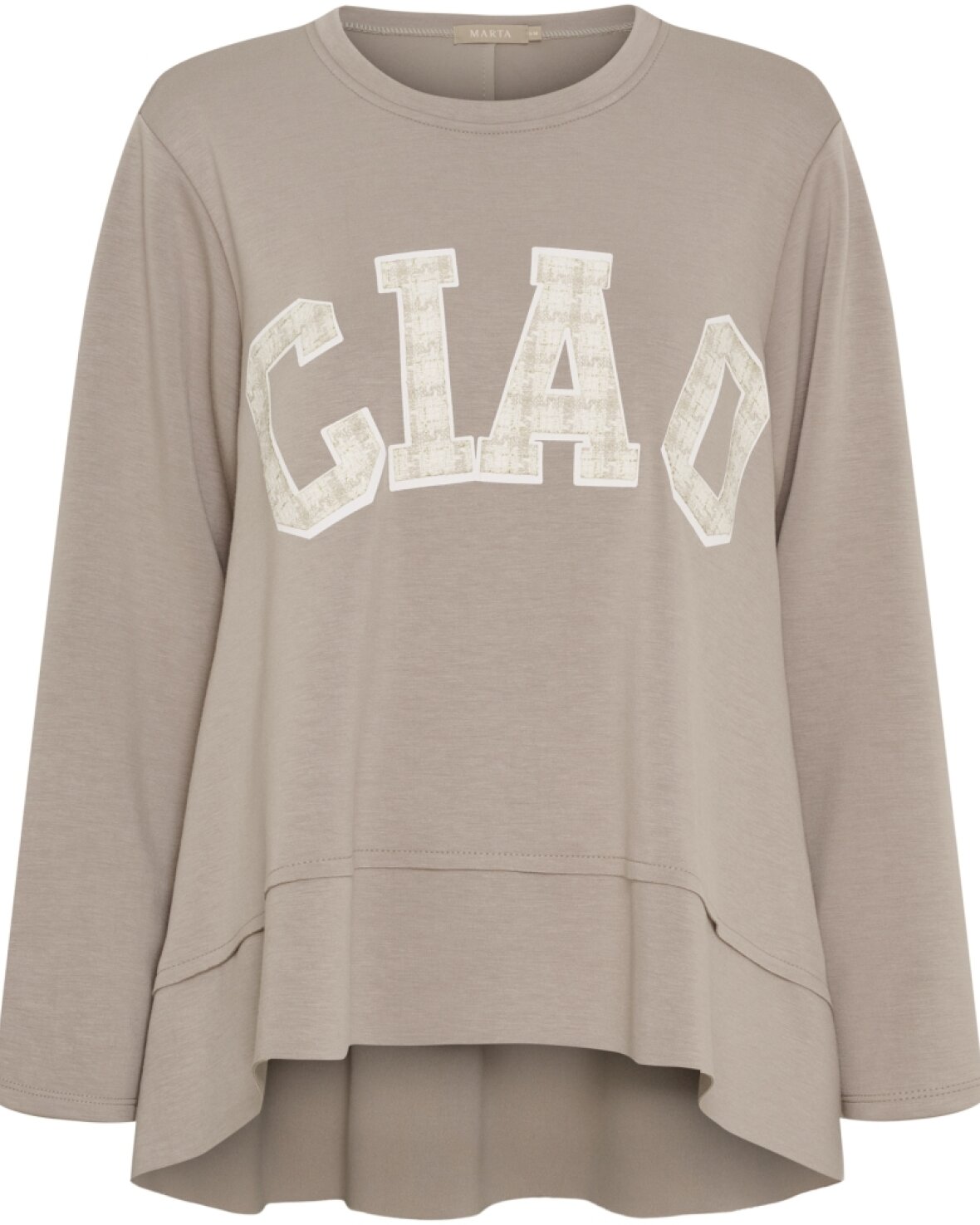 Sweatshirt 85783 fra Marta Du Chateau i fango. Lækker sweatshirt med rund hals, lange ærmer og A facon. Fin med CIAO på fronten.