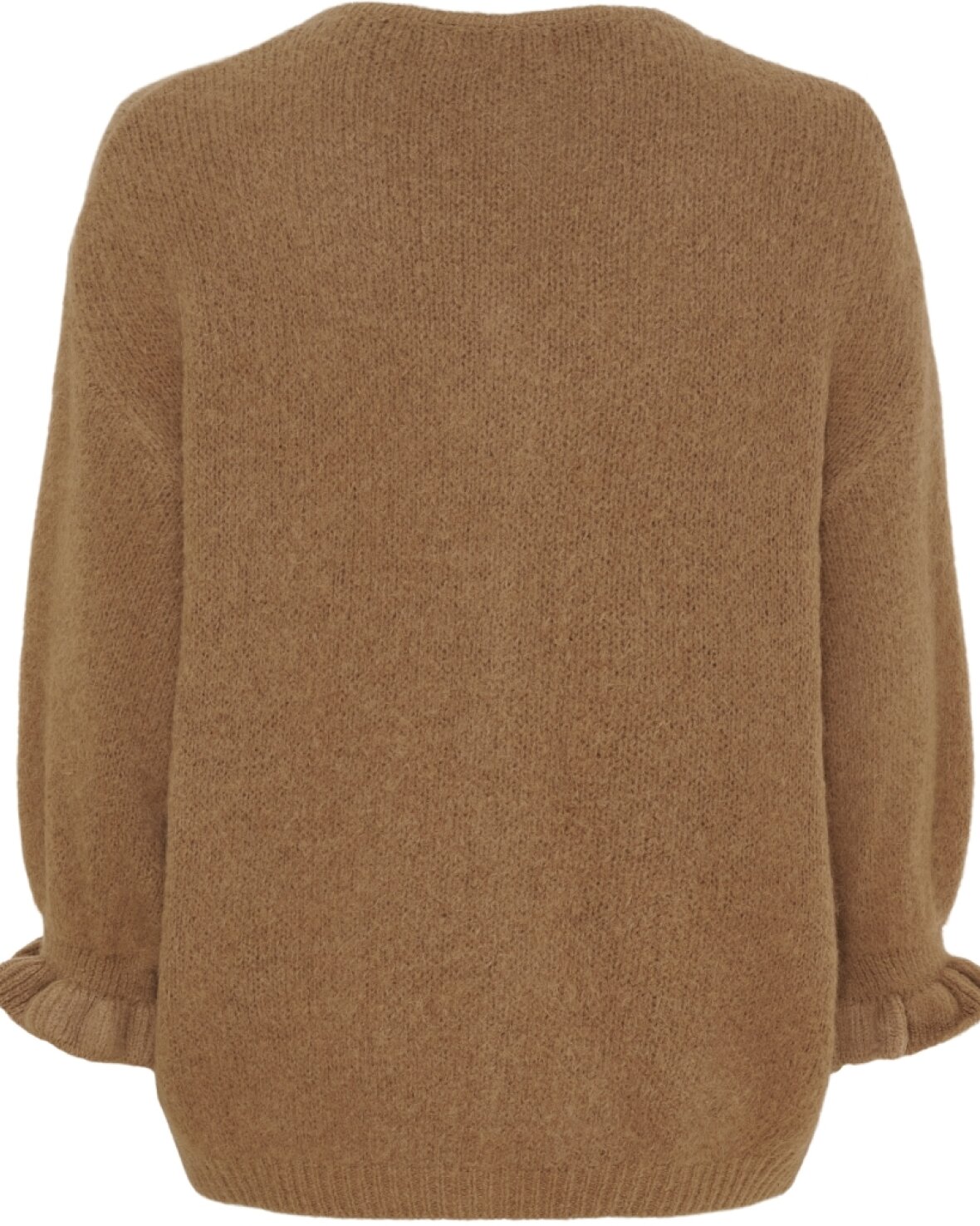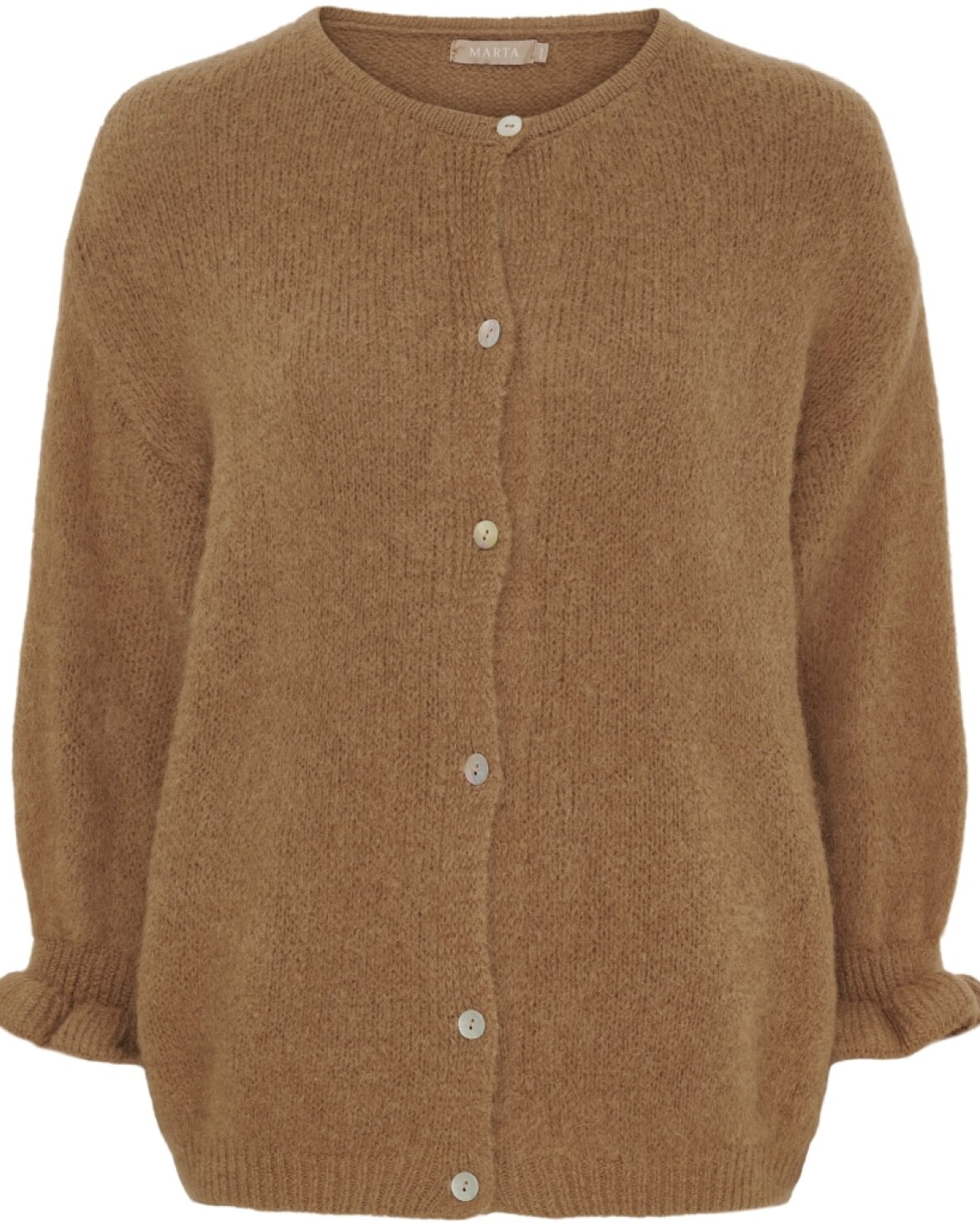 Strik 2413 fra Marta Du Chateau i camel. Lækreste strik cardigan med rund hals, gennemknappet og 3/4 lange ærmer med fin "flæse" detalje