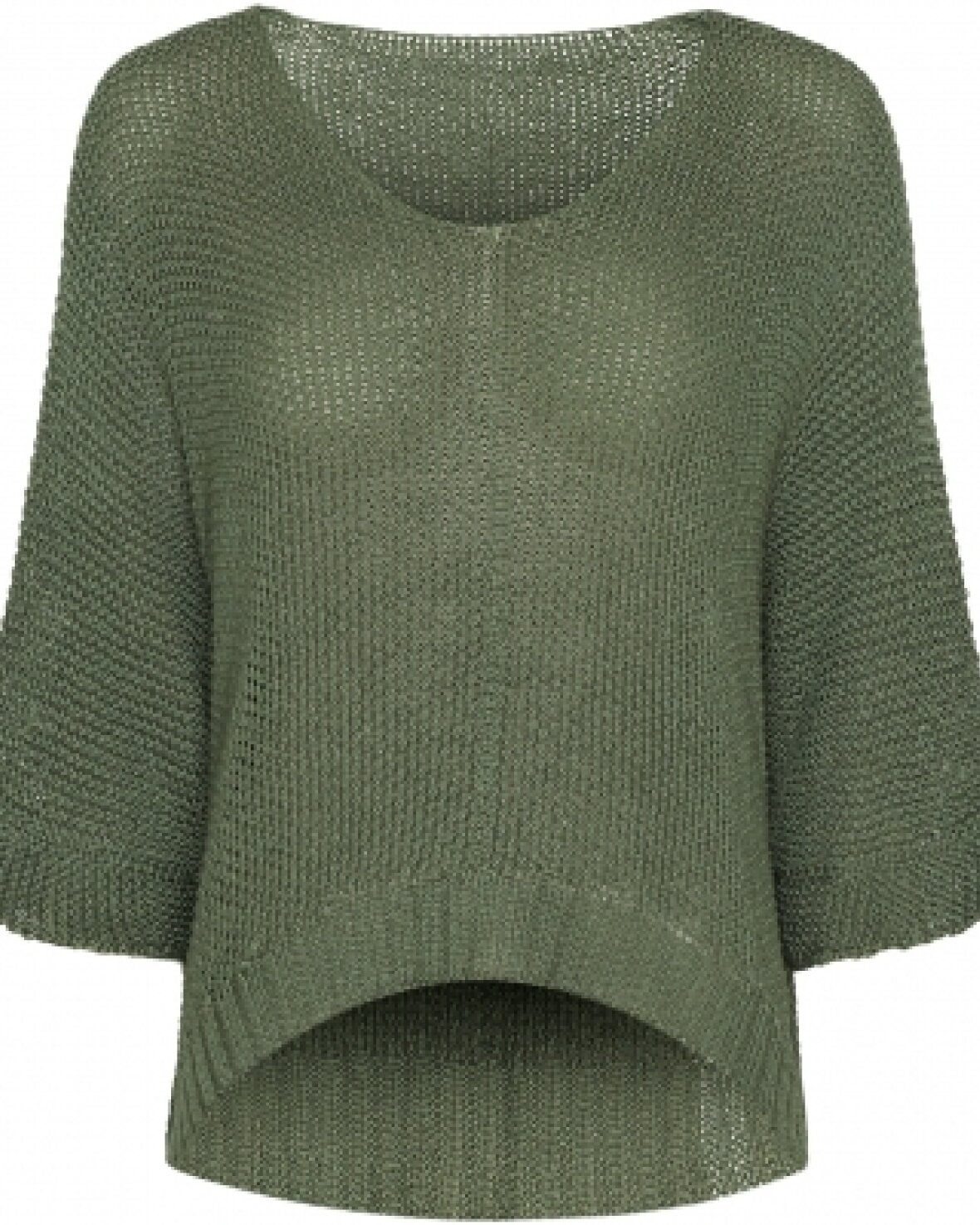 Strik 7010 fra Marta Du Chateau i grøn. Let og fin strik med blød v-udskæring og 3/4 lange ærmer. Den er lidt kortere foran end bagpå.