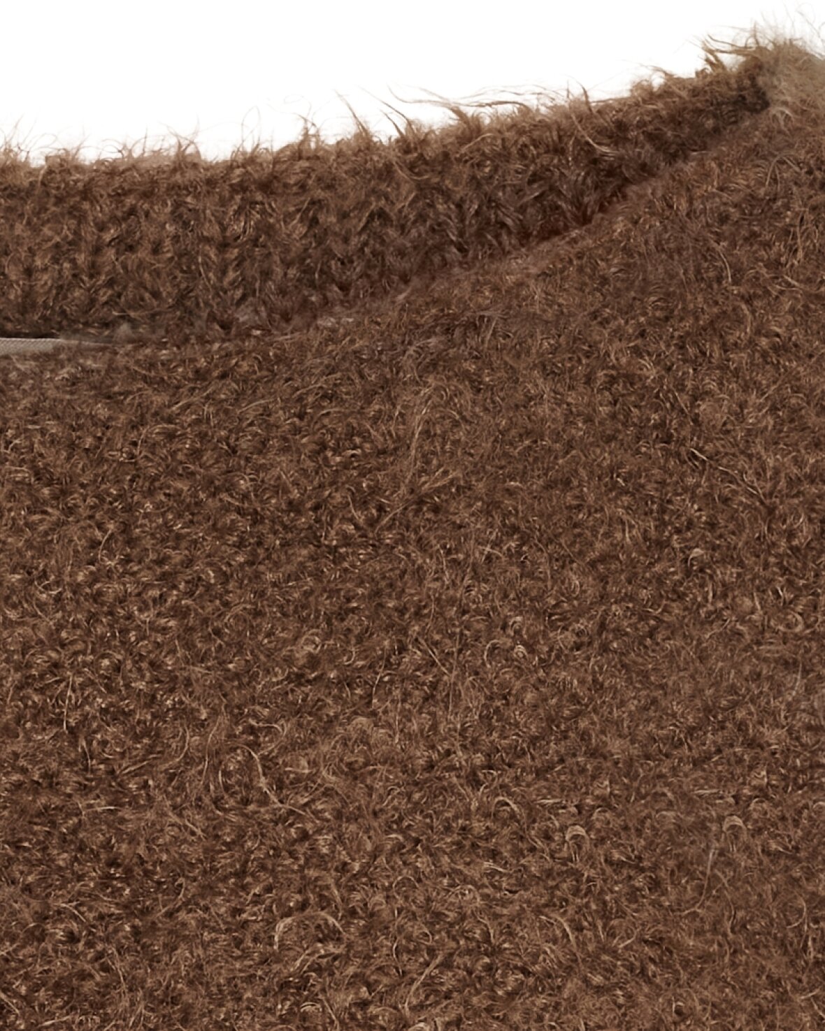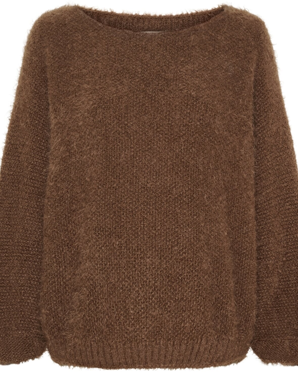 Strik 8038 fra Marta Du Chateau i brun. Vamset og lækker blød strikketrøje. Strikketrøjen har rund hals og let stumpende ærme, smuk med blonde eller mesh under.