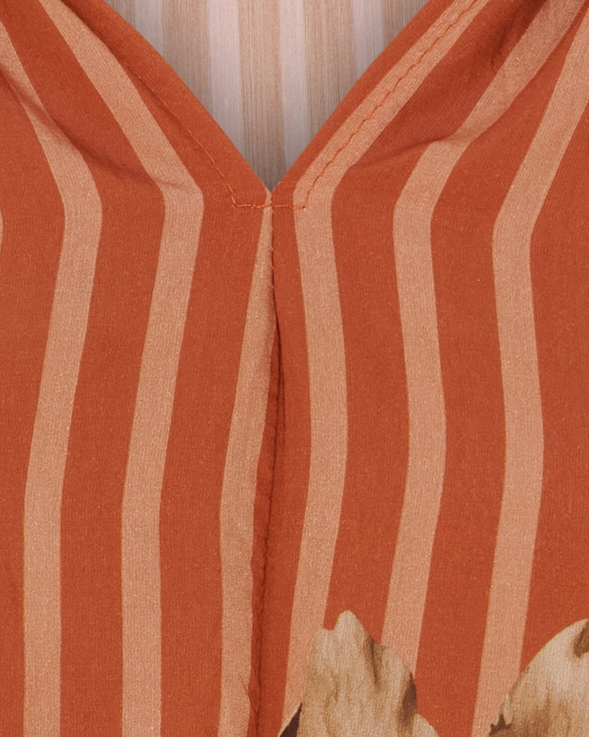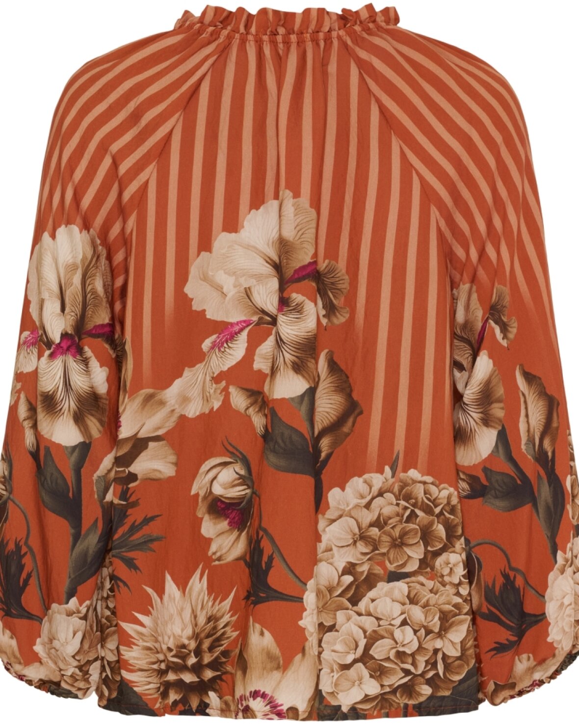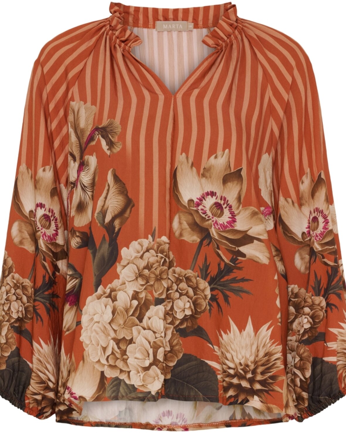 Bluse 003B fra Marta Du Chateau i coccio. Sød bluse med det flotteste print. Blusen har v-udskæring med flæse detalje og er lidt længere bagtil end foran.