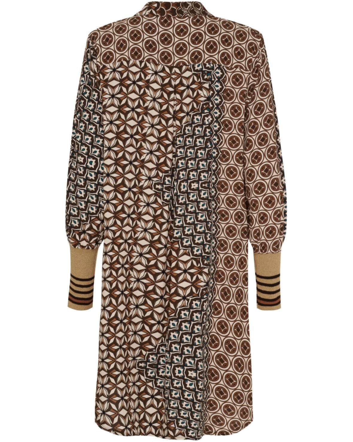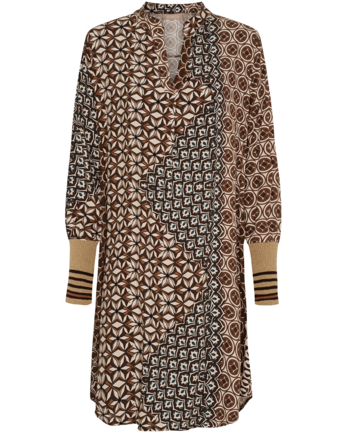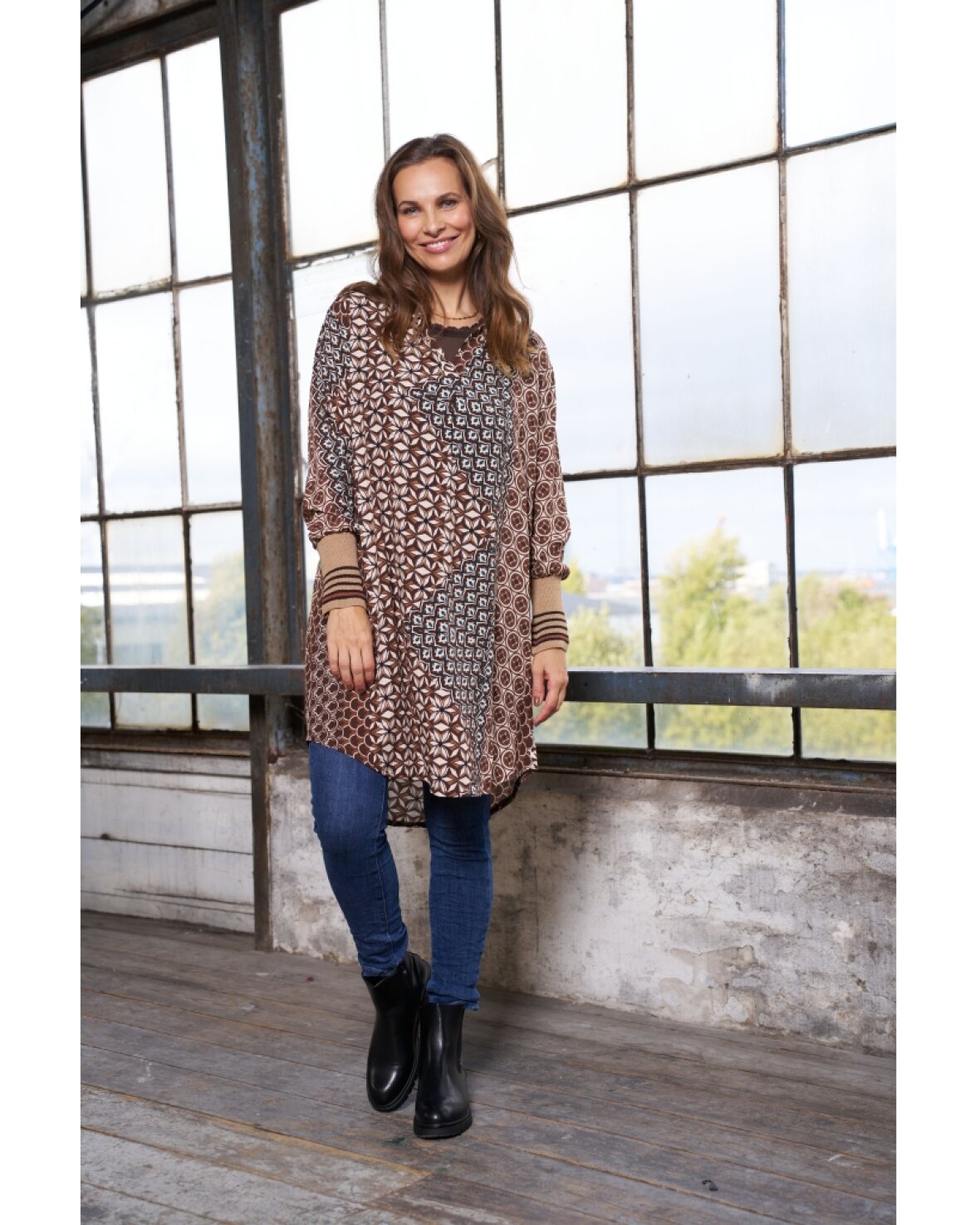 Kjole 25185 fra Marta Du Chateau brune nuancer. Skøn tunika kjole med v-udskæring, lange ærmer med fin detalje nederst.