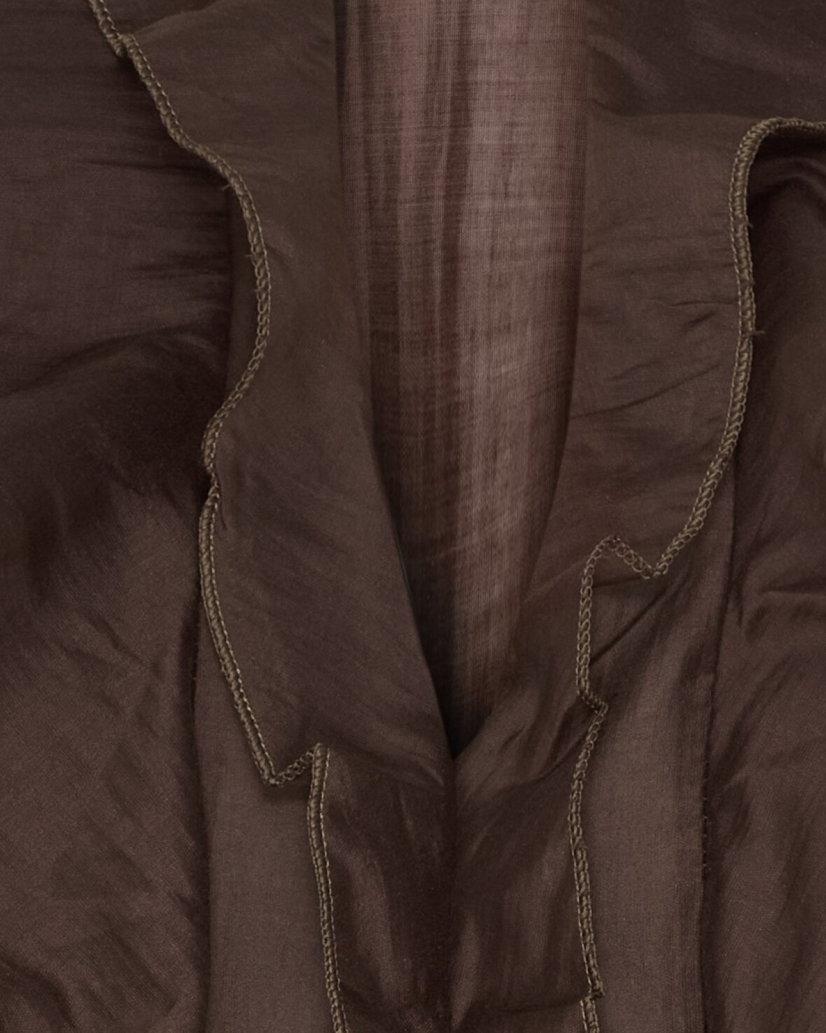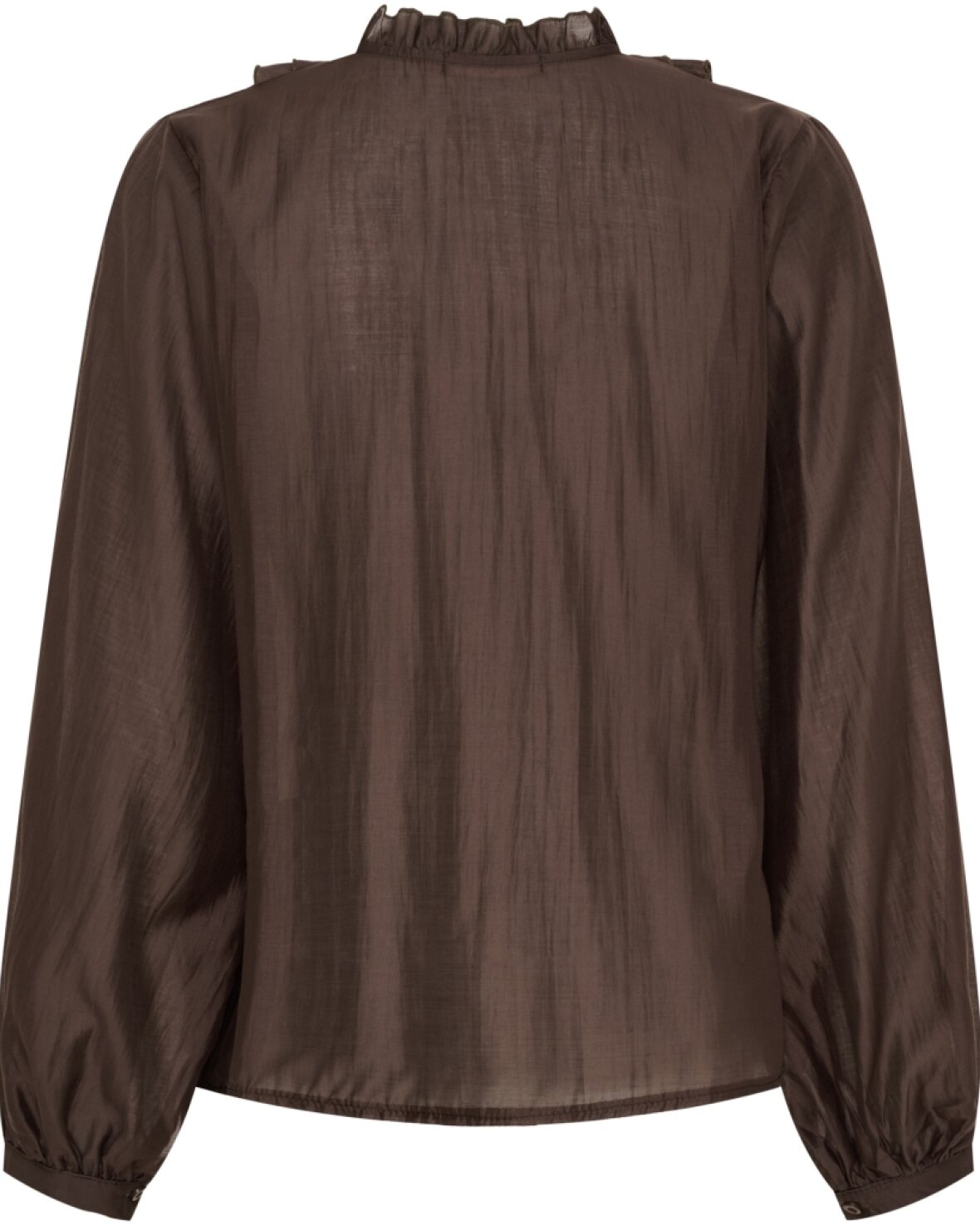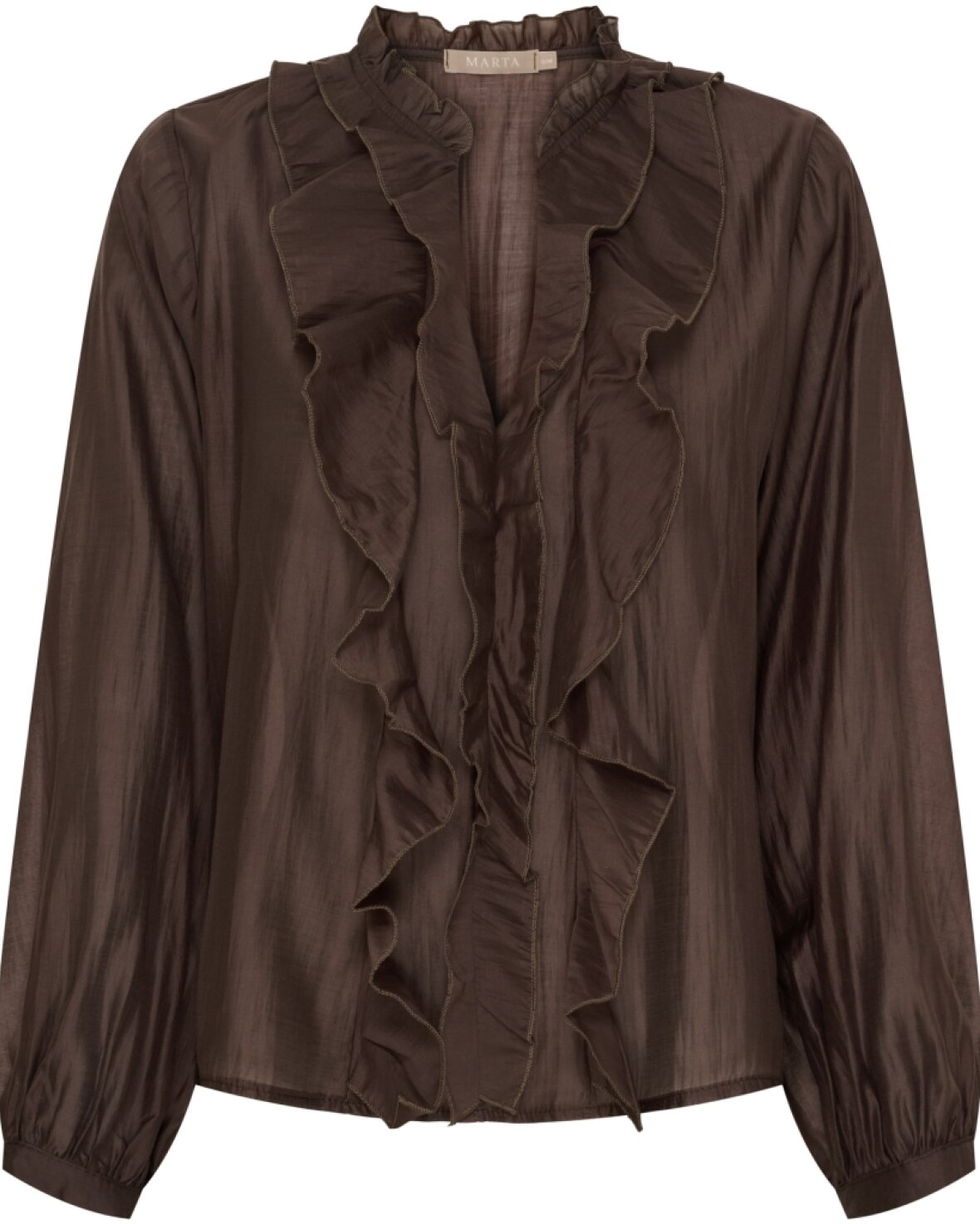 Skjorte 58221 fra Marta Du Chateau i brun. Smuk og elegant skjorte med flot flæsedetalje ned foran. Skjorten har lange ærmer der kan lukkes med en knap.