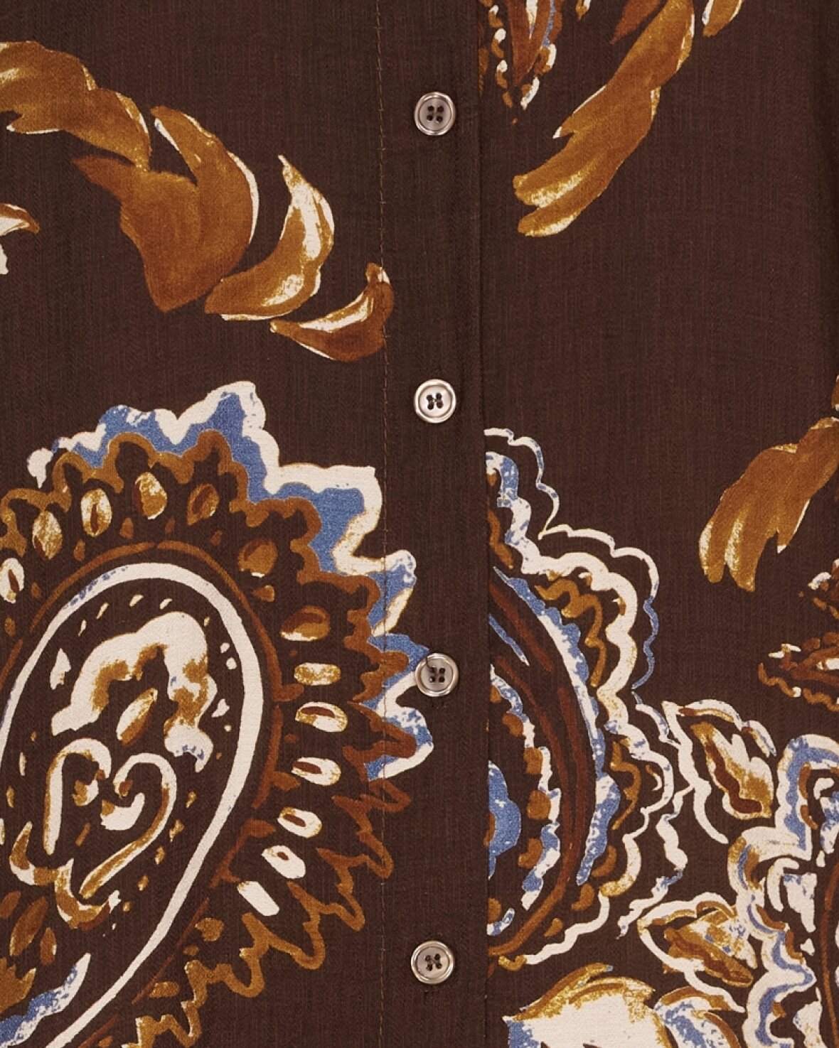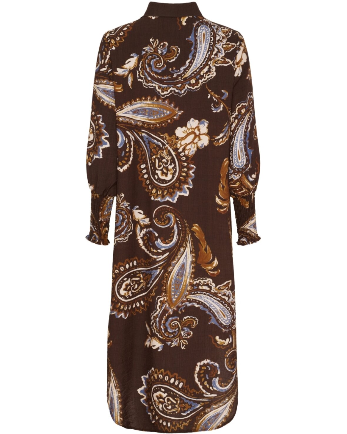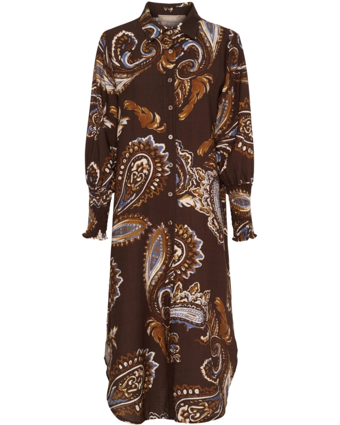 Kjole 7617 fra Marta Du Chateau den smukkeste mørkebrune, med et flot og elegant monster over sig. Kjolen er gennemknappet, har en klassisk krave og ærmer der slutter med smock.
