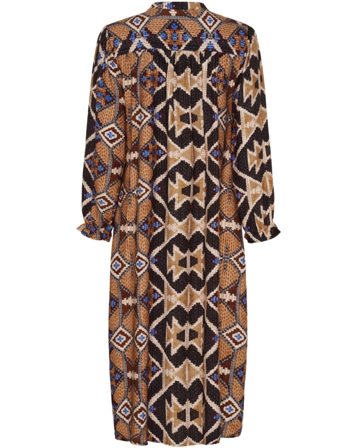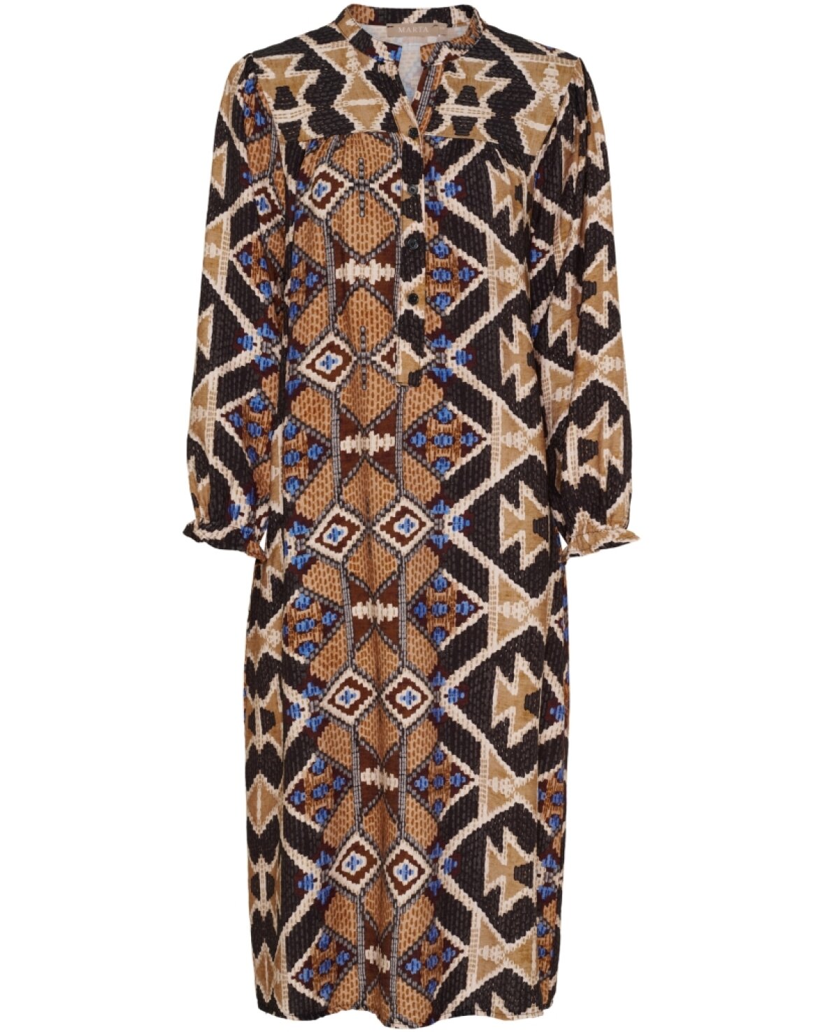 Kjole 7684 fra Marta Du Chateau i sort med et fantastisk mønster. Kjolen har kina krave, knaplukning ned til under brystet og fin længde på kjolen. Lange ærmer på kjolen der slutter med en let flæse.