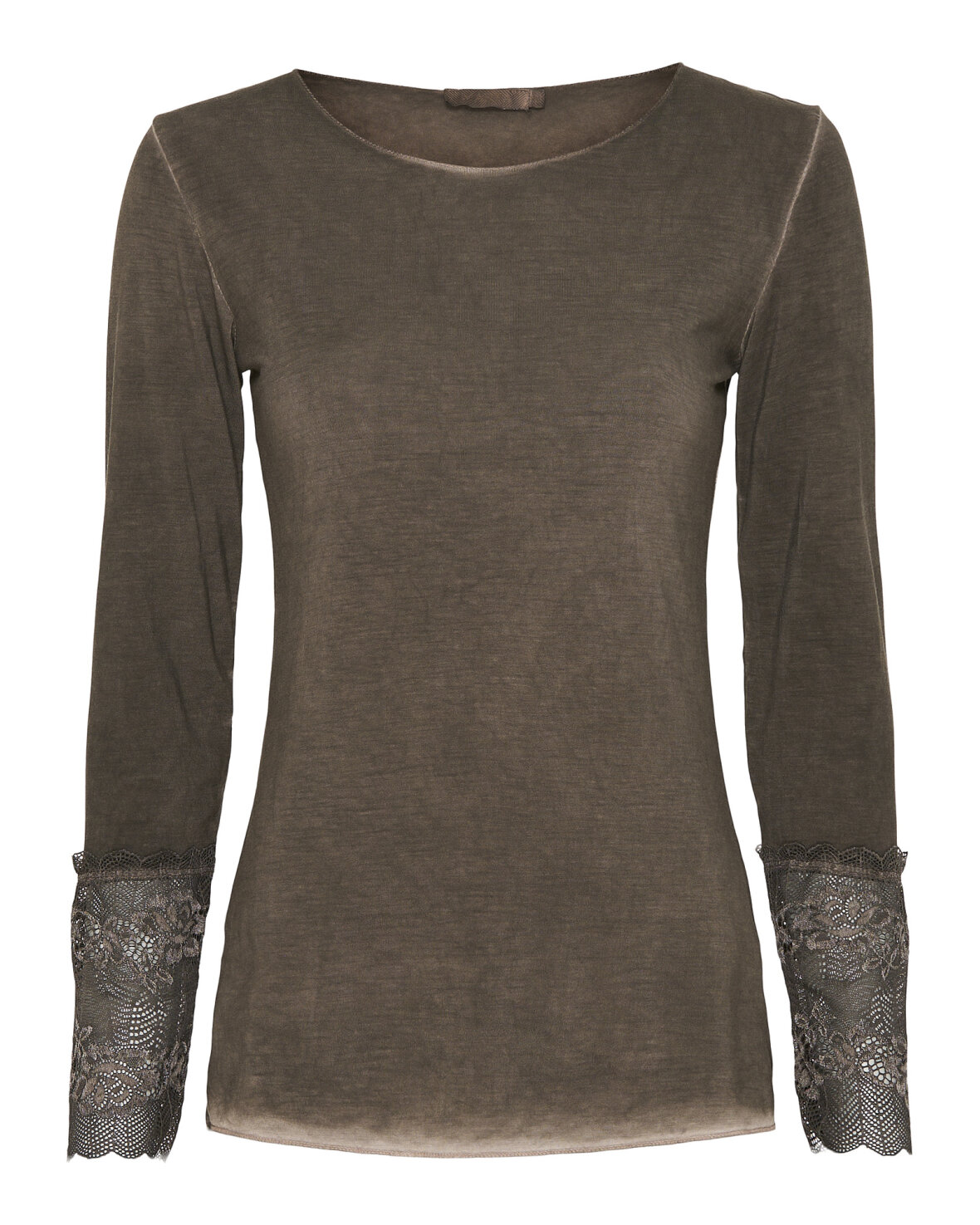 T-shirt 11297 fra Marta Du Chateau i brun. Klassisk t-shirt med lange ærmer, hvor det nederste stykke er med den smukkeste blonde. Den har rund hals udskæring og er lækker og behagelig at have på.