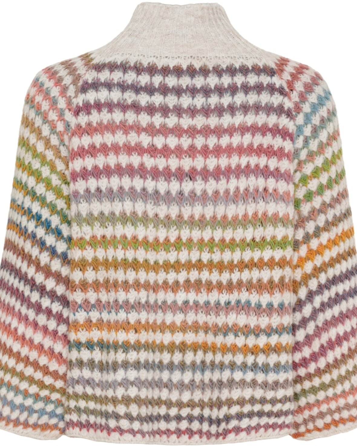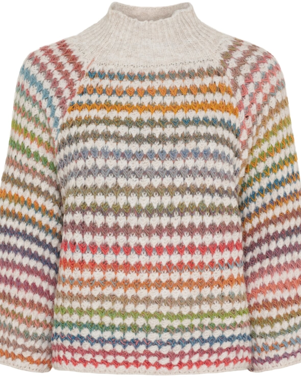 Strik 25453 fra Marta Du Chateau i beige med et lækkert farvespil. Strikken har 3/4 lange ærmer og høj hals.