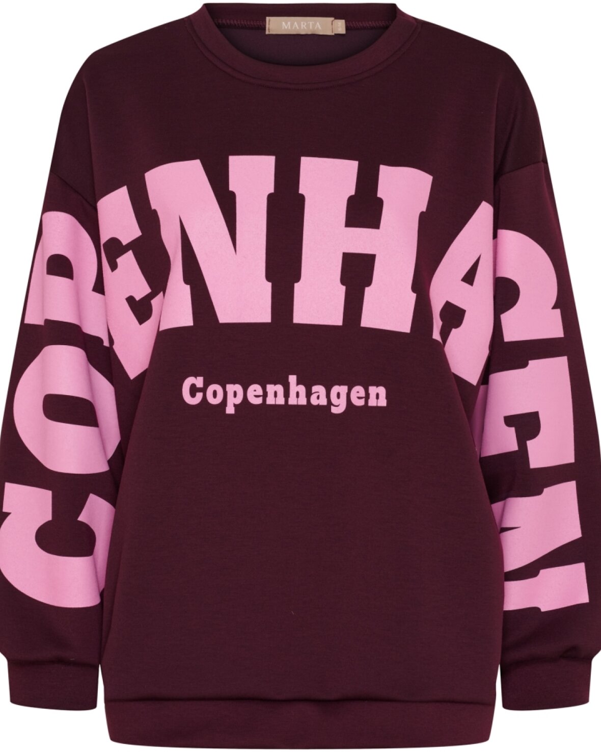 Sweatshirt 22659 fra Marta Du Chateau i bordeaux. Blød og lækker sweatshirt med smart COPENHAGEN skrevet henover bryst og arme. Let oversize i størrelsen.