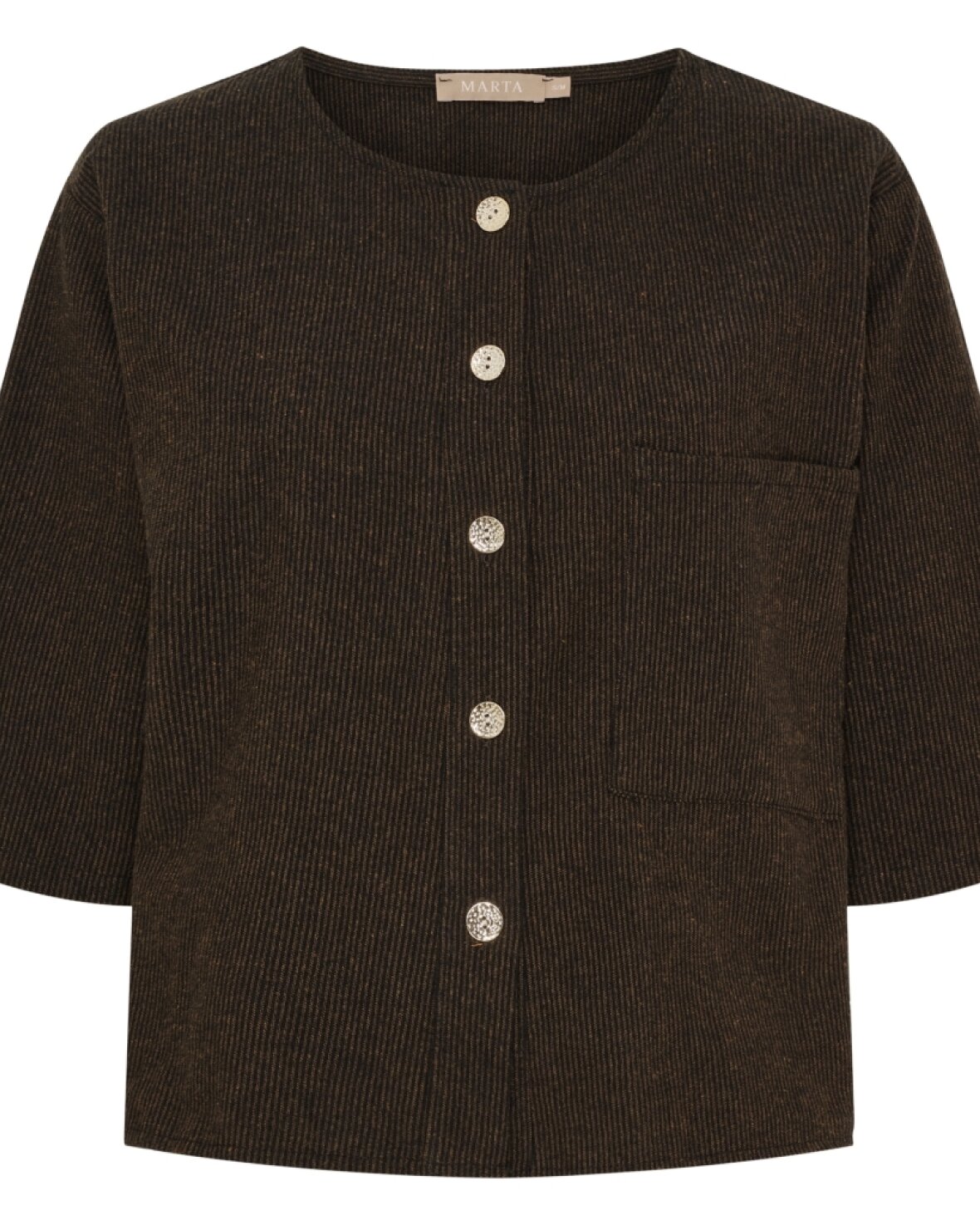Jakke 6878 fra Marta Du Chateau i brun. Lækreste blød jakke med rund hals, gennemknappet, 3/4 lange ærmer og med påsatte lommer på brystet.