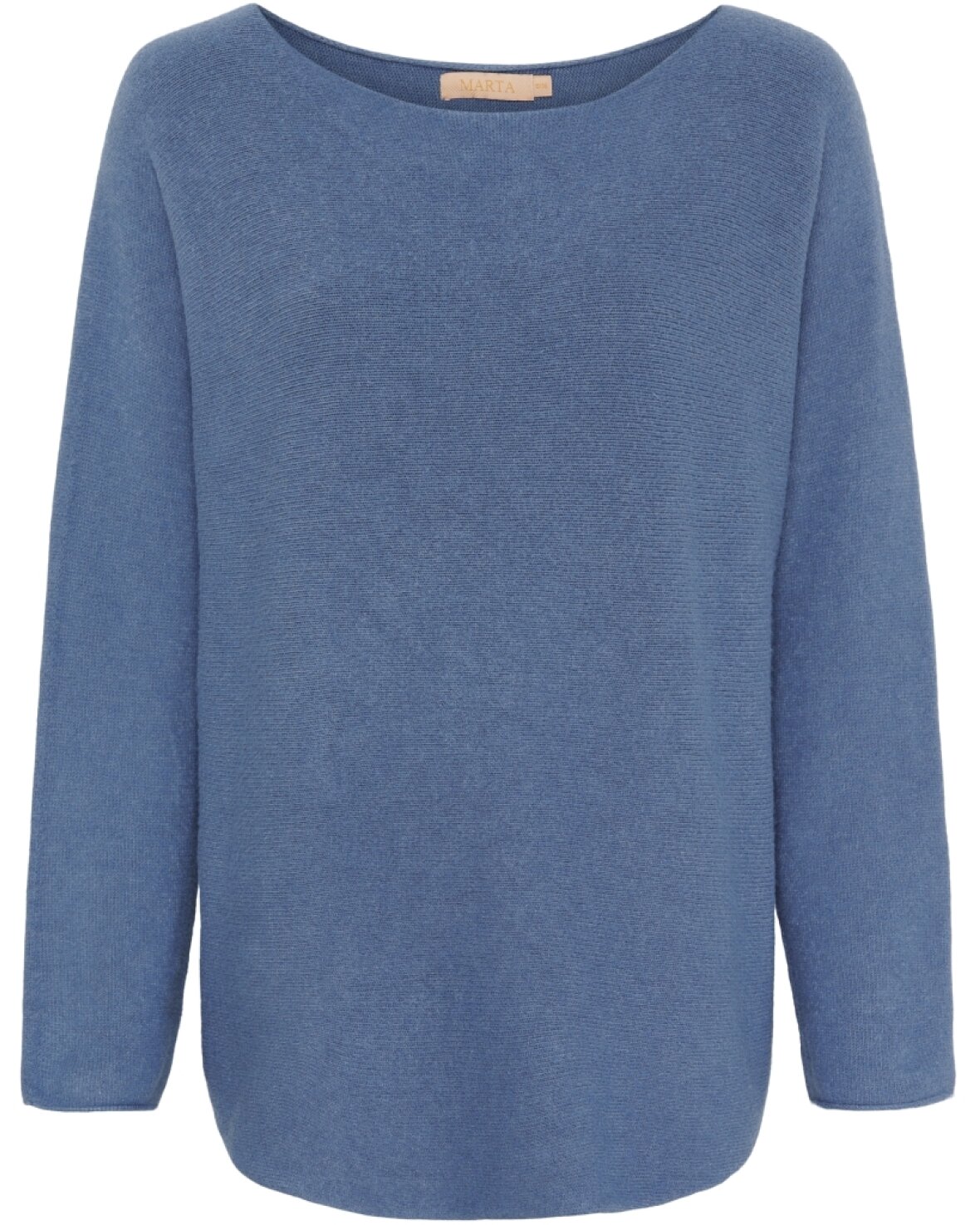 Strik 5001 fra Marta Du Chateau i jeans blå. Lækker blød strik med rund hals, lange ærmer og fin længde på kroppen. Strikken runder let forneden.
