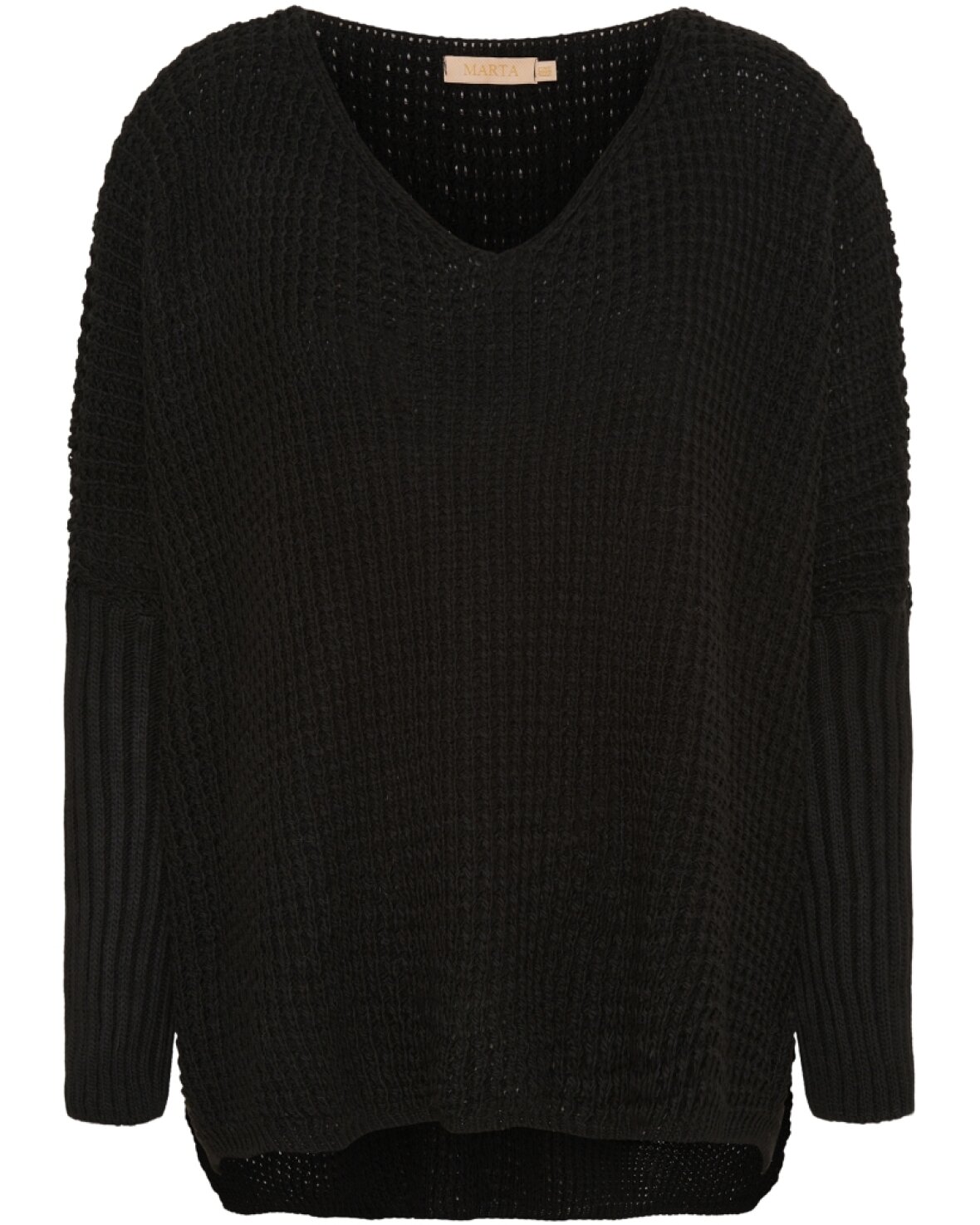 Strik 18236 fra Marta Du Chateau i sort. Lækker oversize strik med V-udskæring, lange smalle ærmer. Strikken har mere længde bagpå end foran.