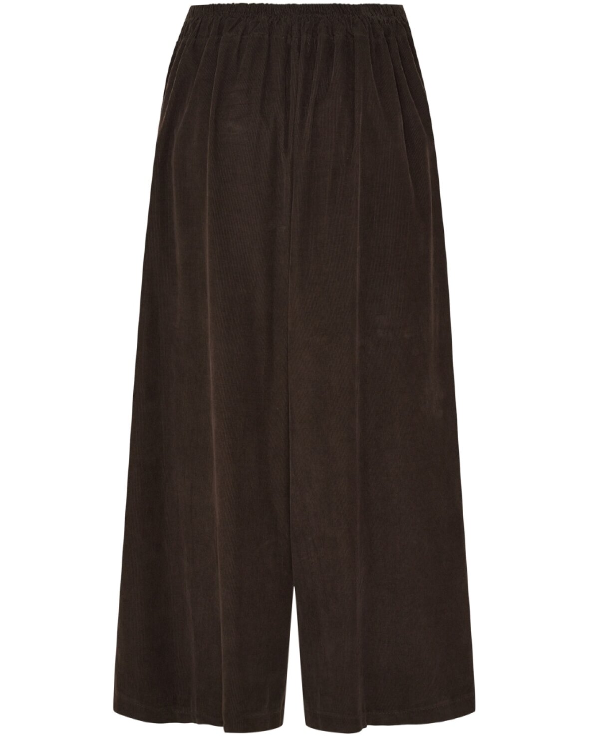 Buks 256244-3 fra Marta Du Chateau i brun baby fløjl. Stumpende vidde buks med sød binde detalje i livet. Skøn vidde buks der både fungere godt med sneakers eller støvler. Buksen har fast linning foran og elastik bagpå, hvilket gør at buksen sidder fantastisk på.