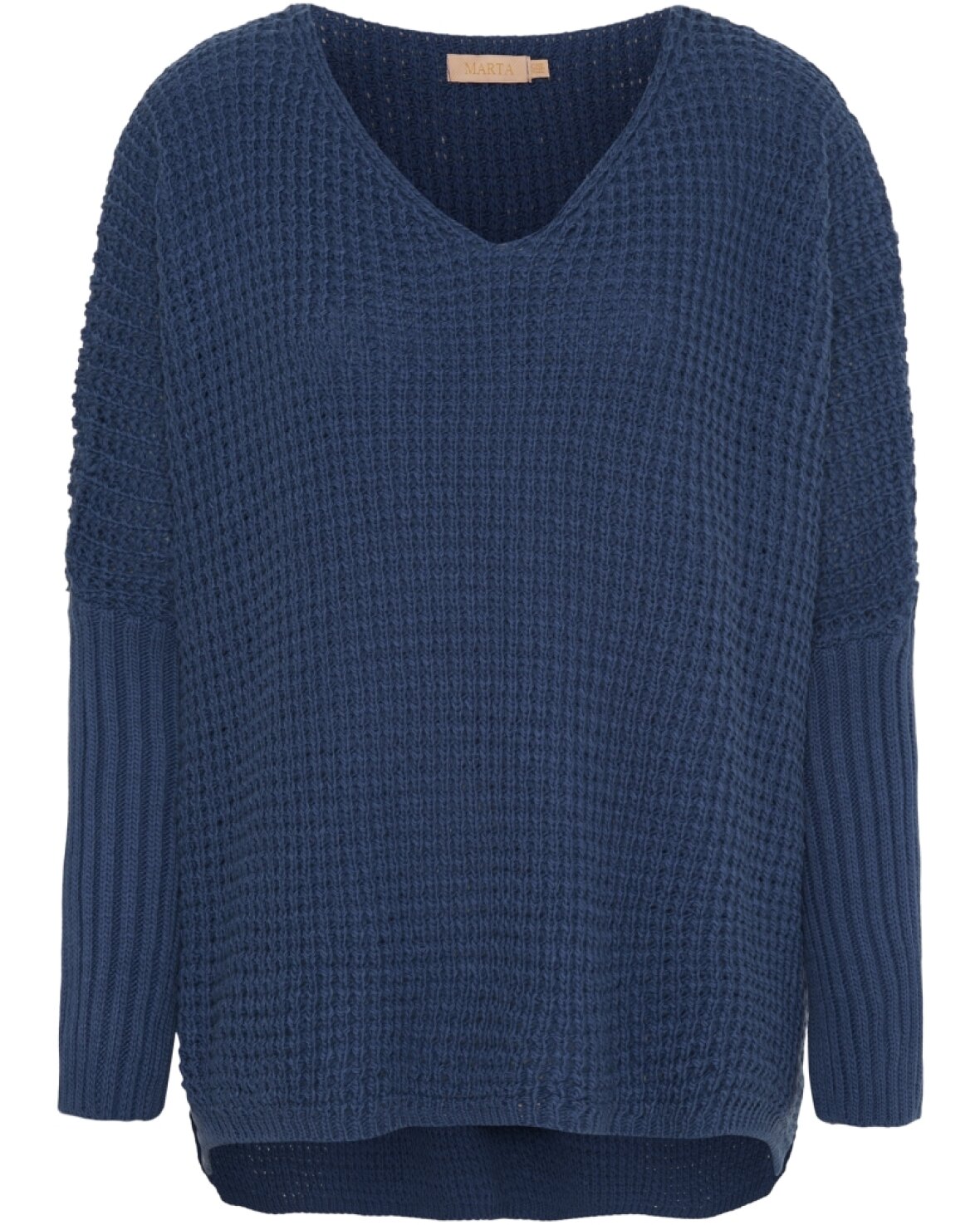Strik 18236 fra Marta Du Chateau i blå. Lækker oversize strik med V-udskæring, lange smalle ærmer. Strikken har mere længde bagpå end foran.