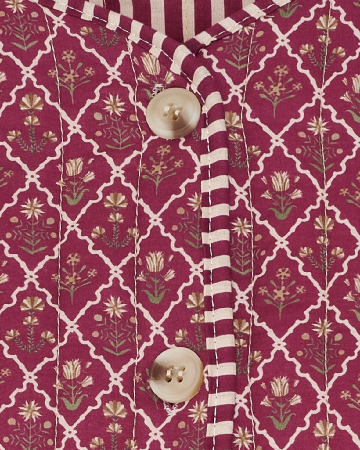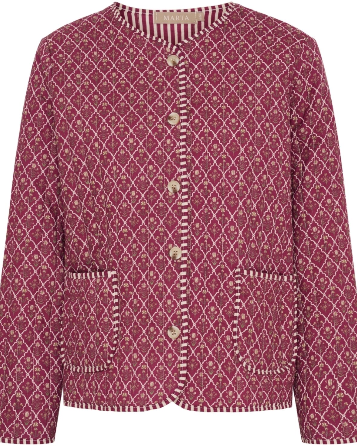 Jakke 86567 fra Marta Du Chateau i bordeaux. Skøn quiltet jakke med blød v-udskæring, knaplukning ned foran, lange ærmer og påsatte lommer foran.