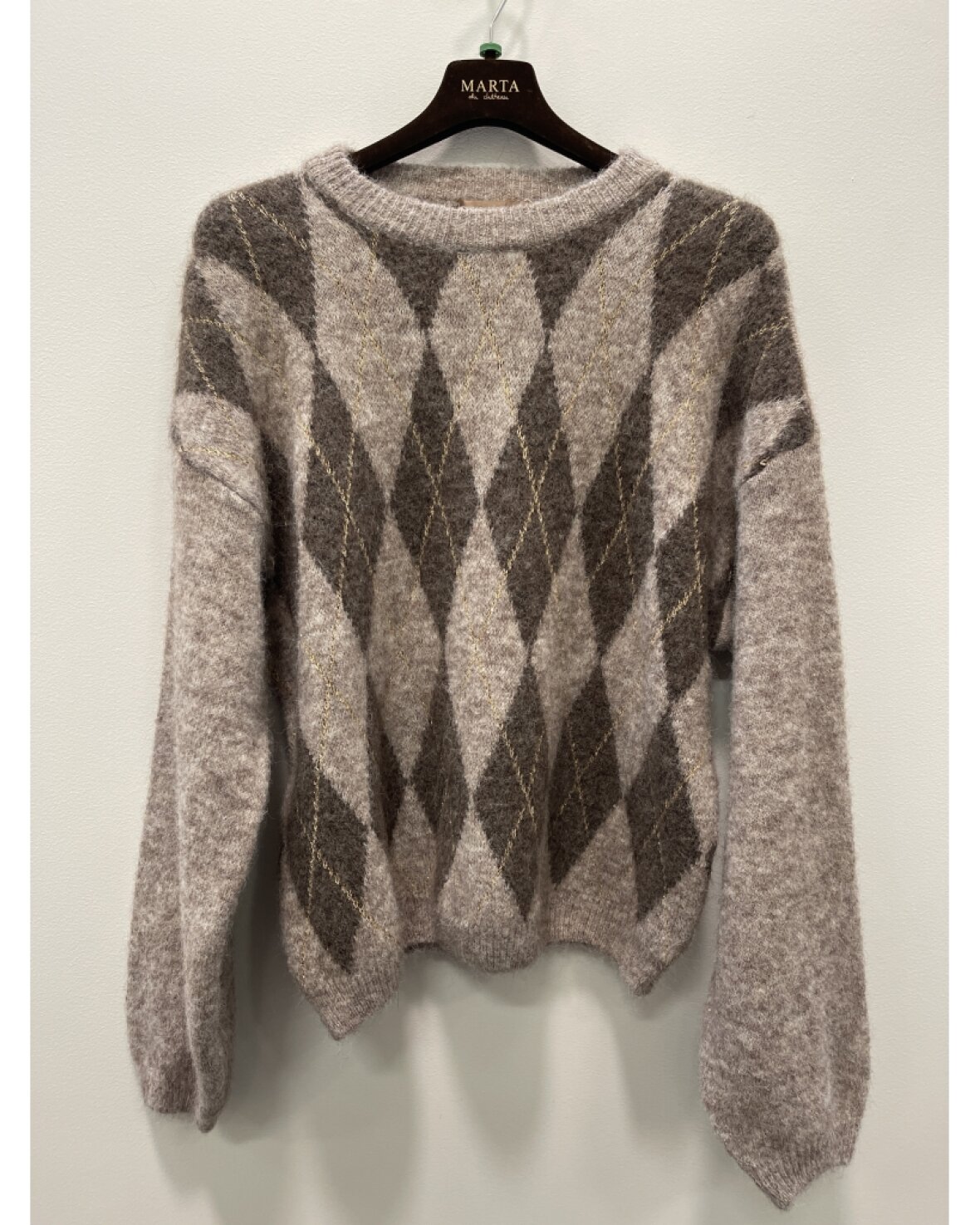 Strik 82171 fra Marta Du Chateau i beige med guld. Smuk strik med flot mønster. Strikken har rund hals, lange ærmer med let drop og en fin pasform.