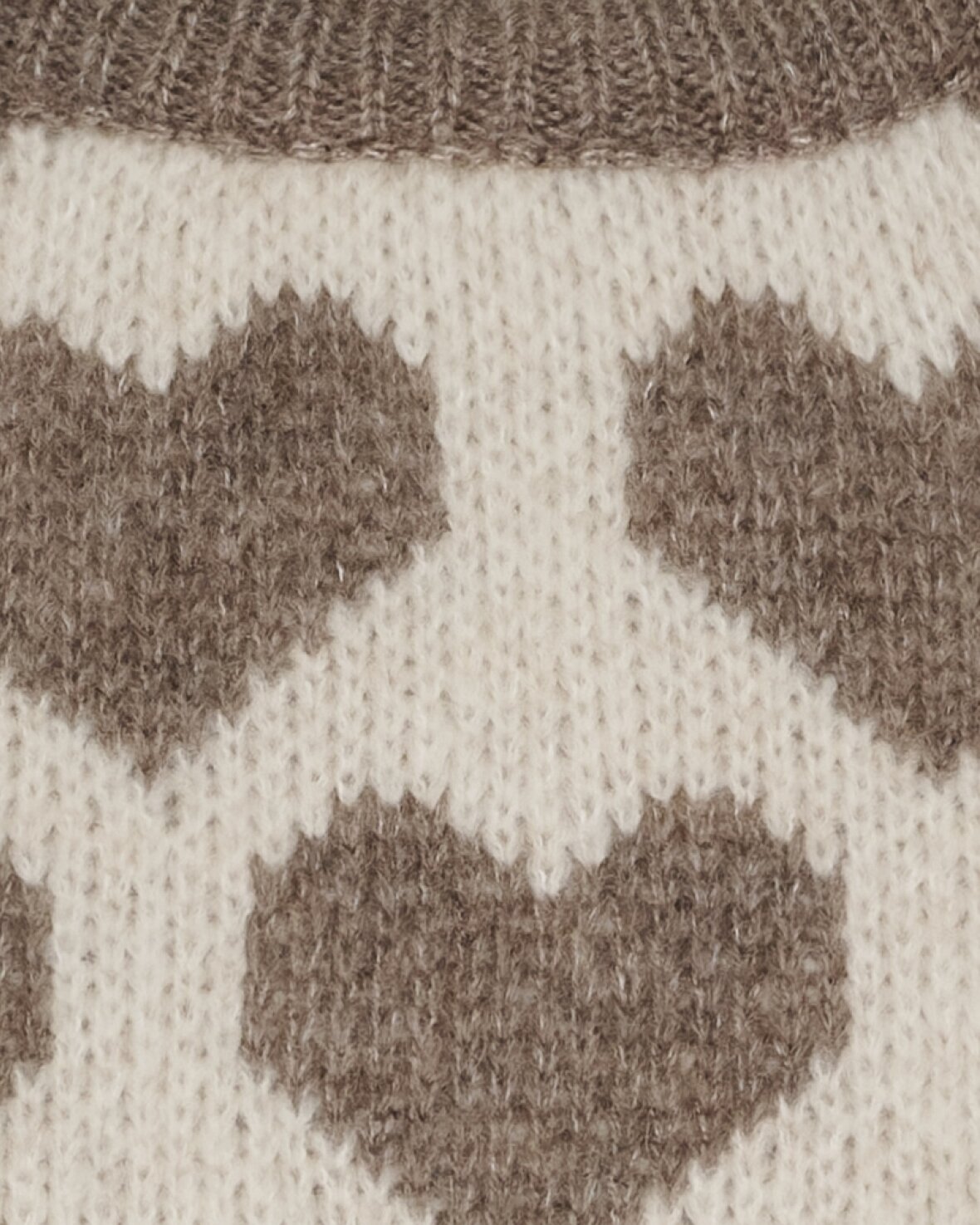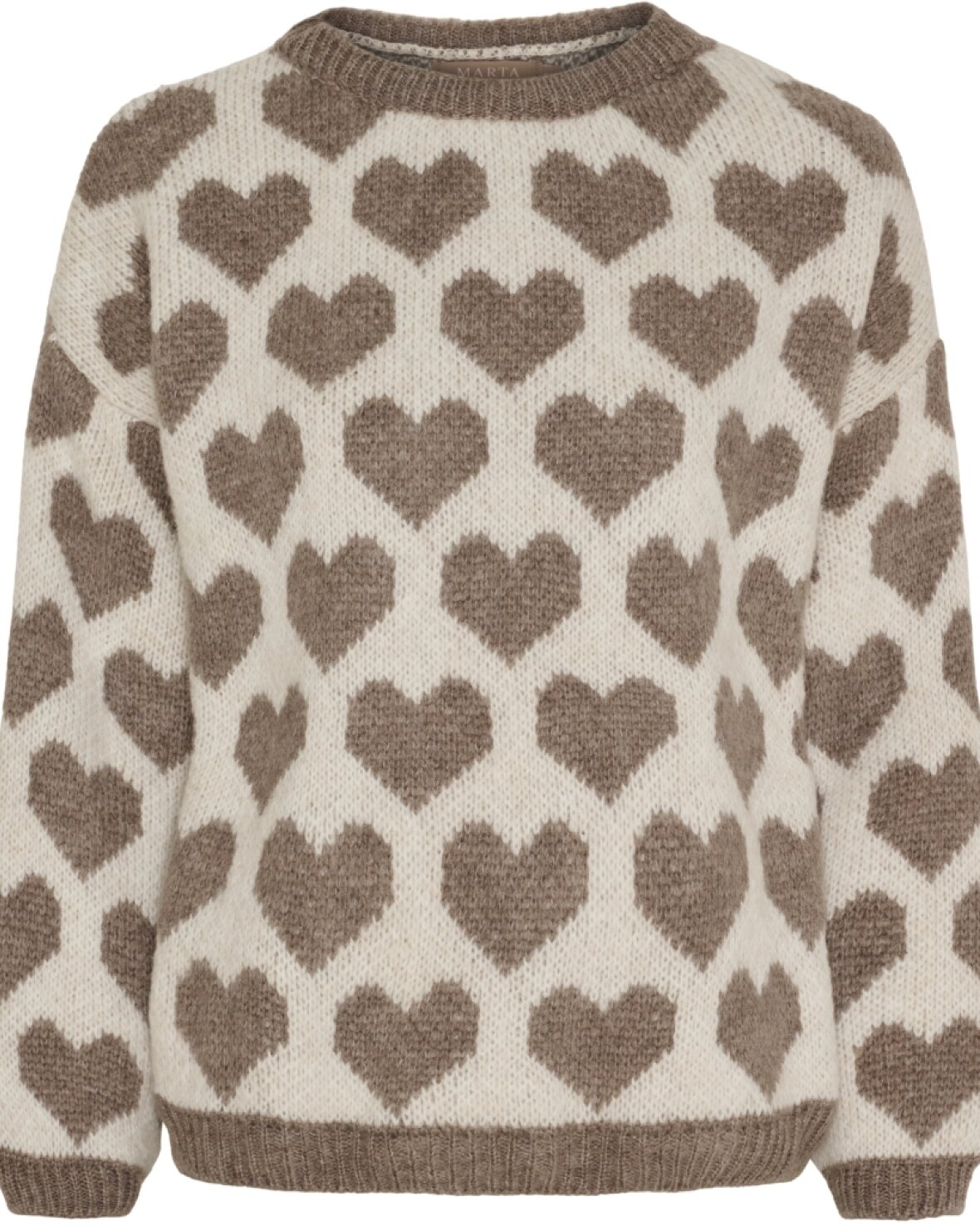 Strik 9688 fra Marta Du Chateau i creme med mørk beige hjerter. Sød og blød strik med rund hals, lange ærmer og fin pasform.