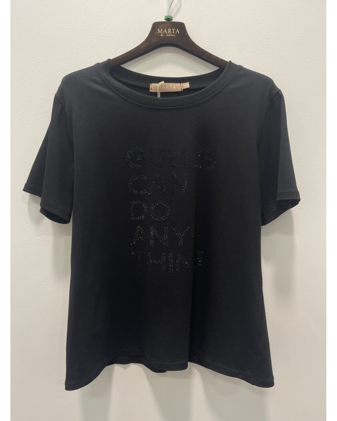 T-shirt 38188 fra Marta Du Chateau i sort med fine små similisten på fronten. "GIRLS CAN DO ANYTHING" T-shirten har skrift på front, rund hals og kort ærme.