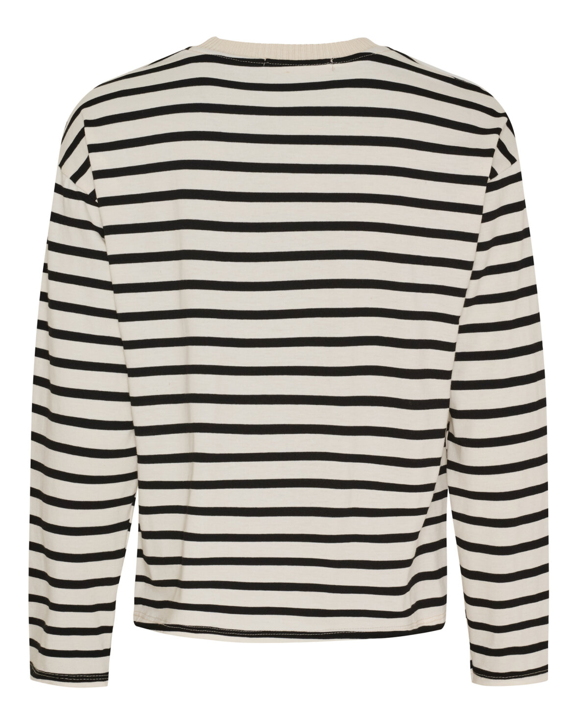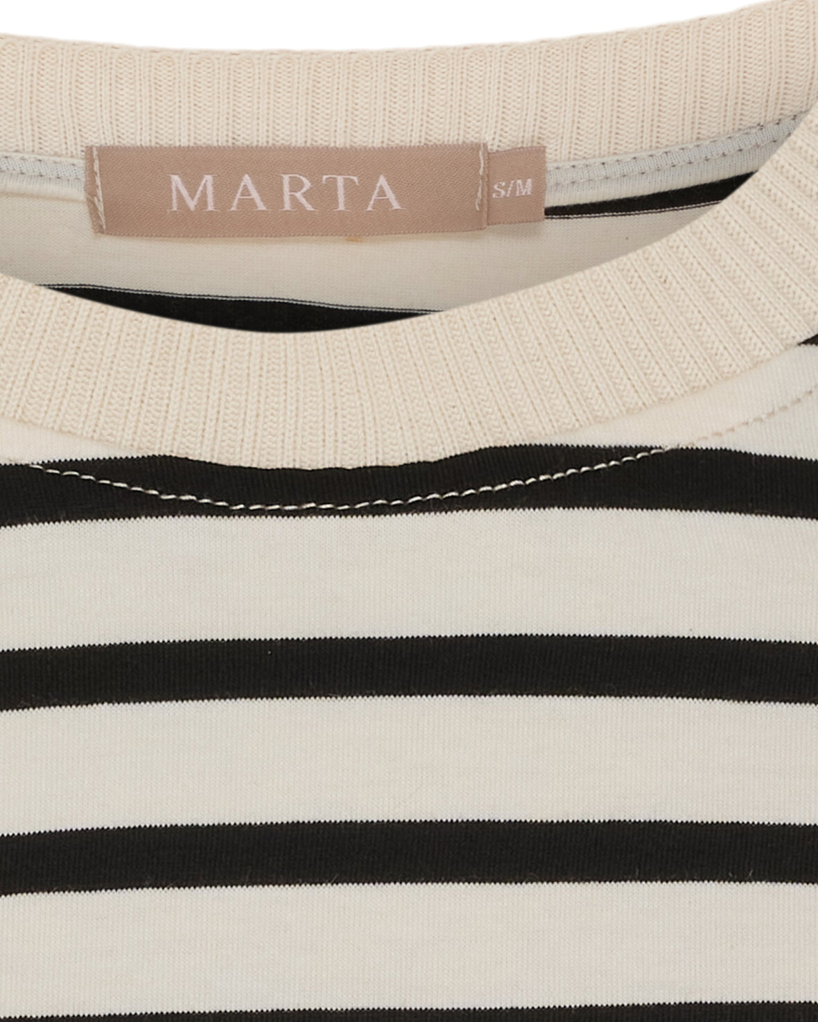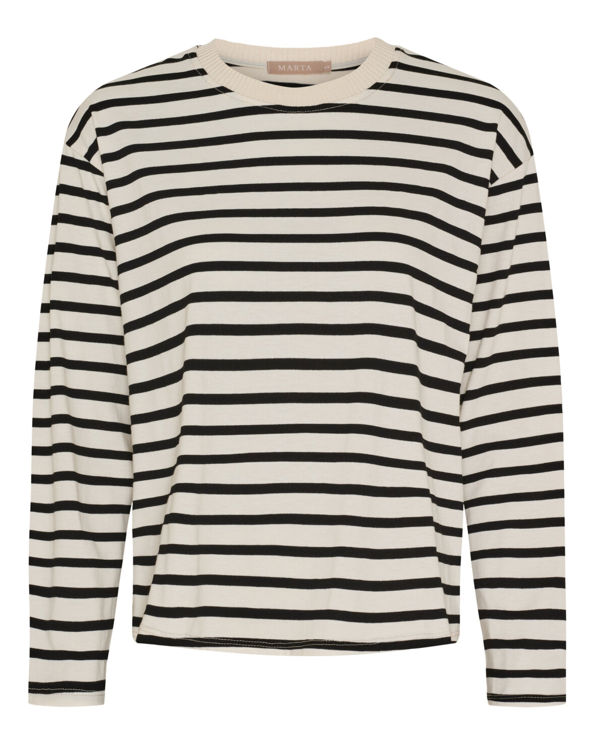 T-shirt 58709 fra Marta Du Chateau i creme med sorte striber. Skøn, let boxet t-shirt med rib kant i halsen og lange ærmer. Lækker og blød t.-shirt til hver dag.