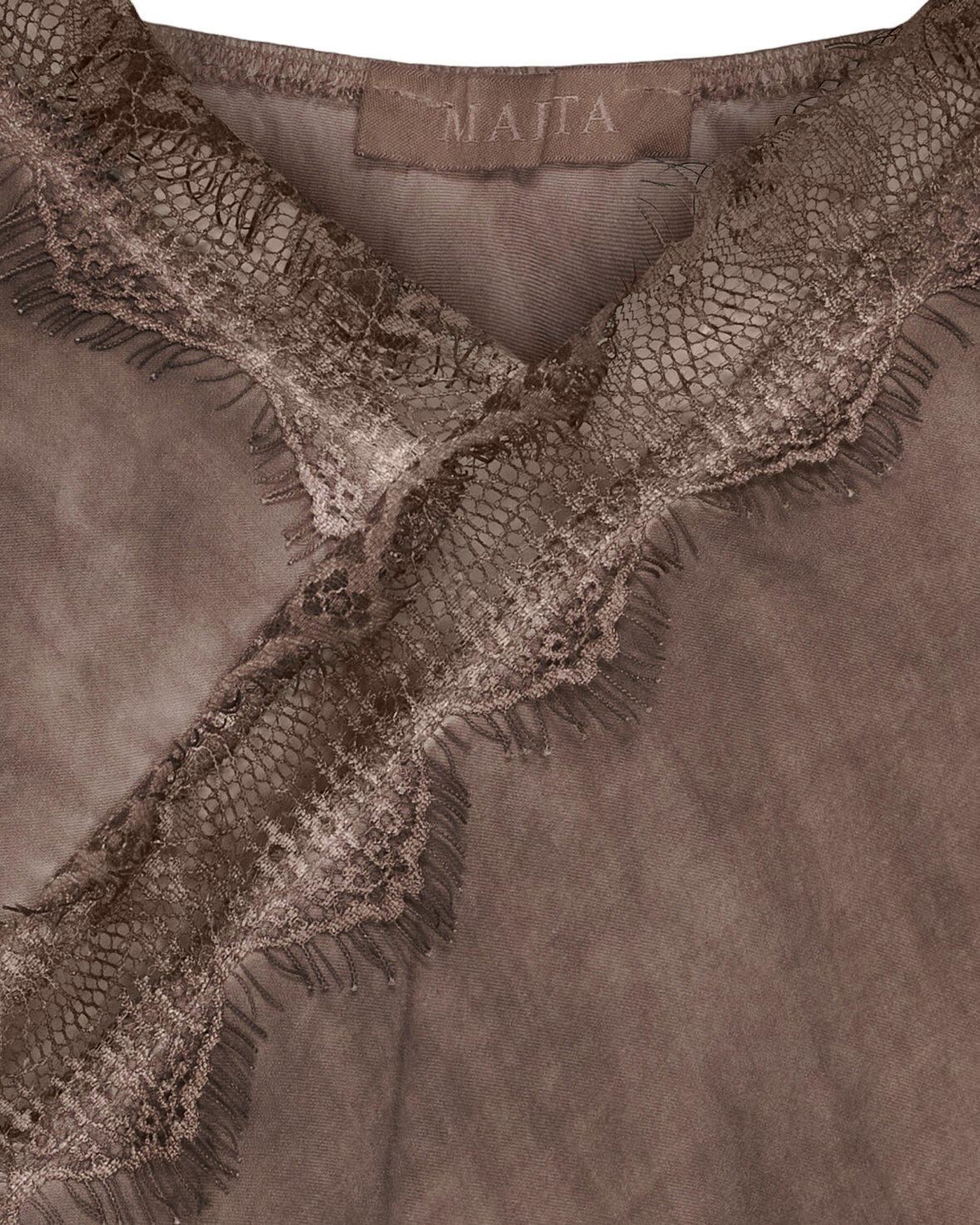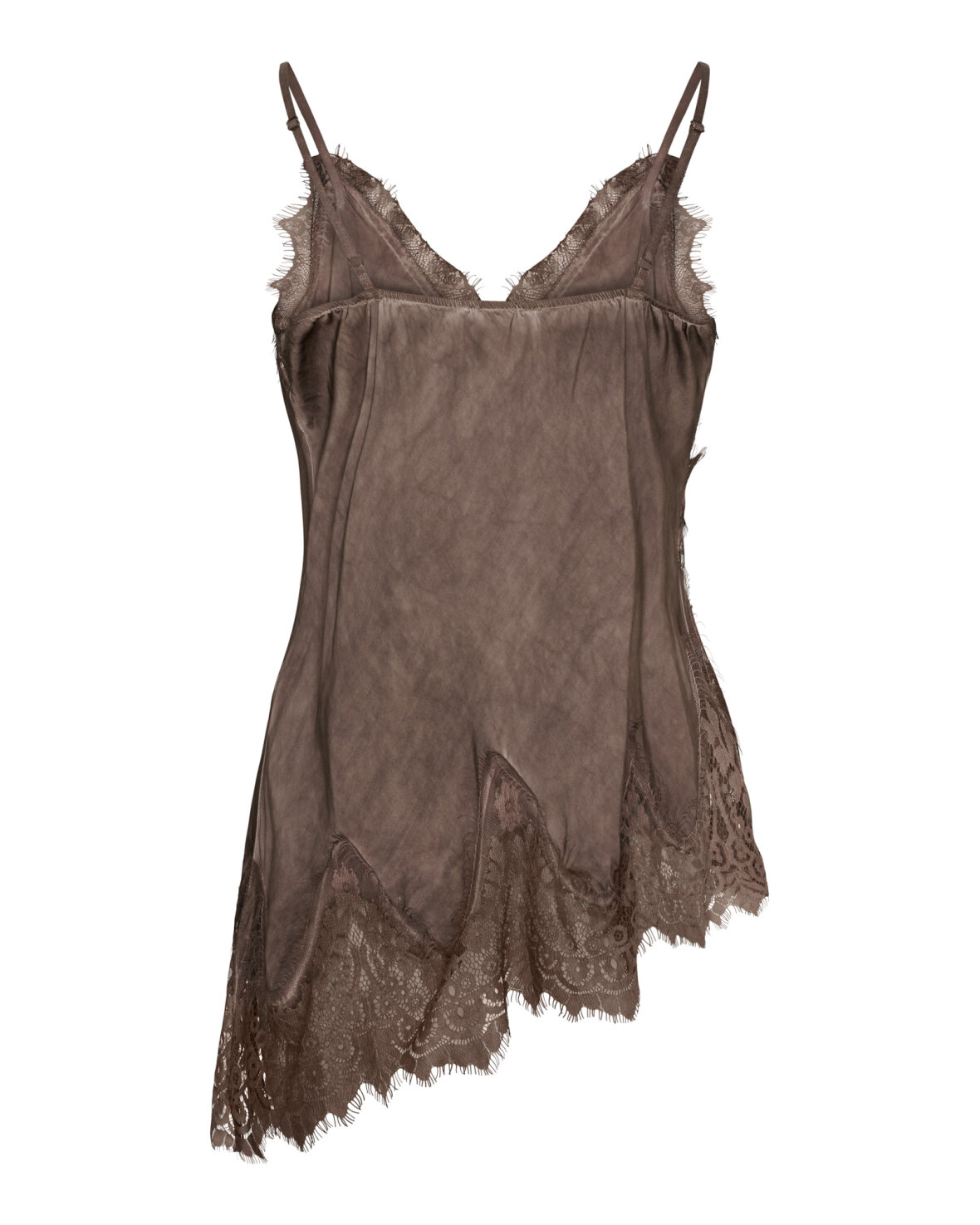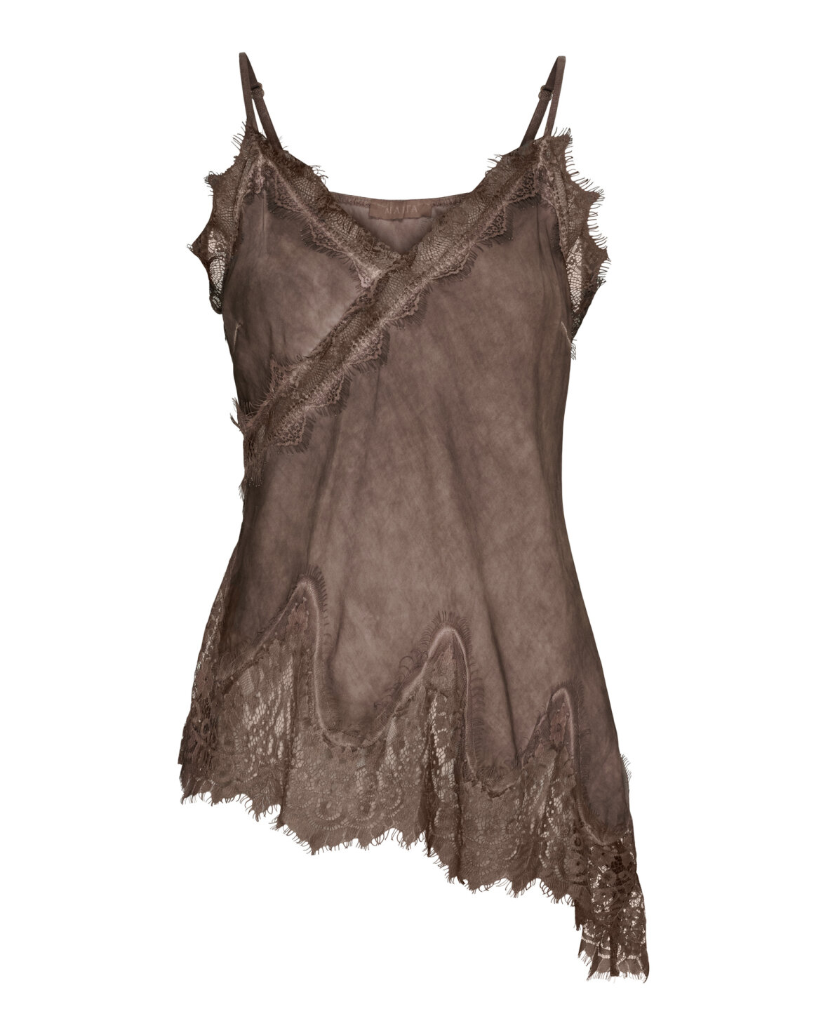 Top 23408 fra Marta Du Chateau i brun. Sød blondetop med tynde regulerbare stropper og asymetrisk i bunden.
