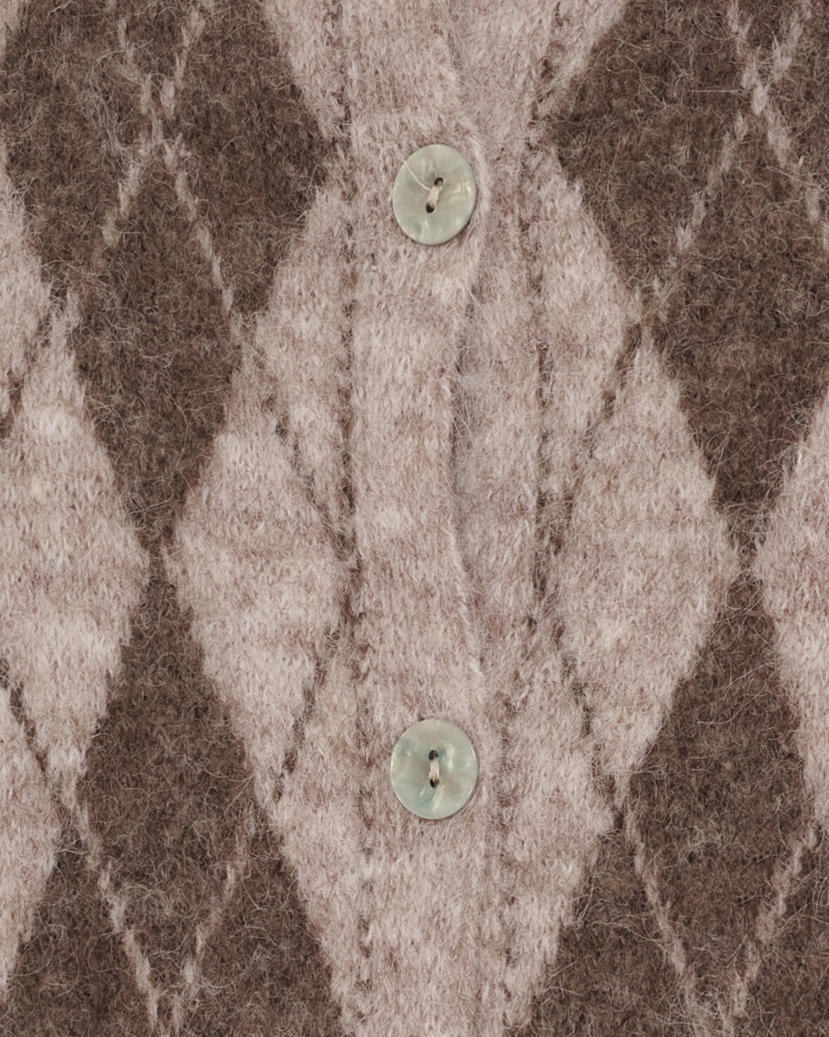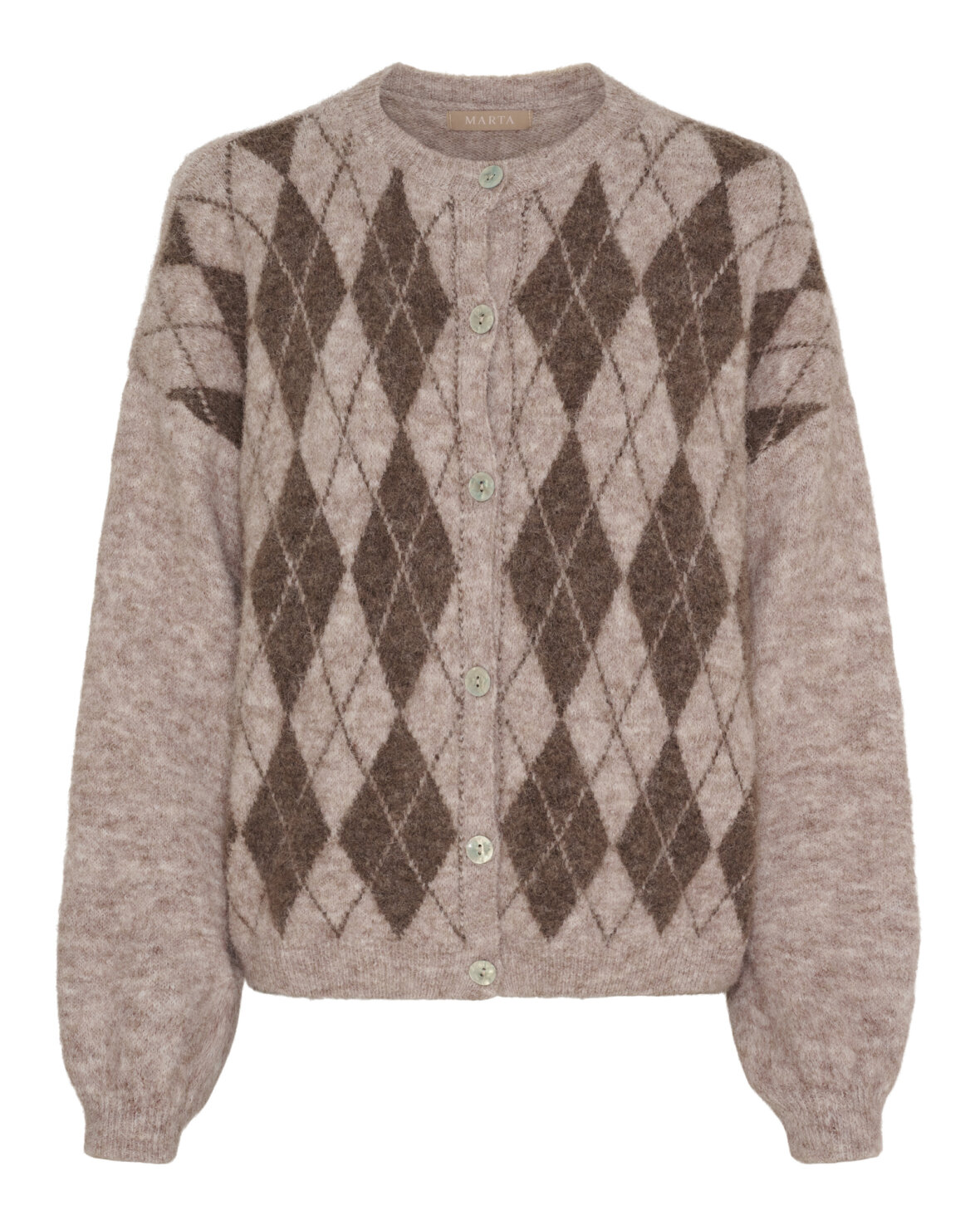 Strik 8225 fra Marta Du Chateau i fango med smukt mønster på fronten. Cardigan har lange ærmer, rund hals og er gennemknappet.
