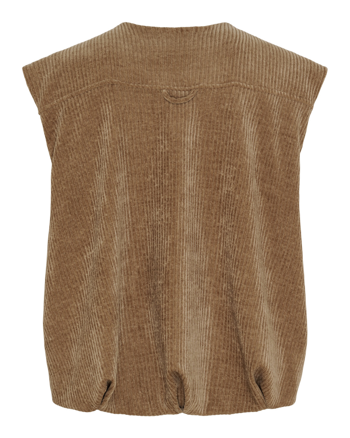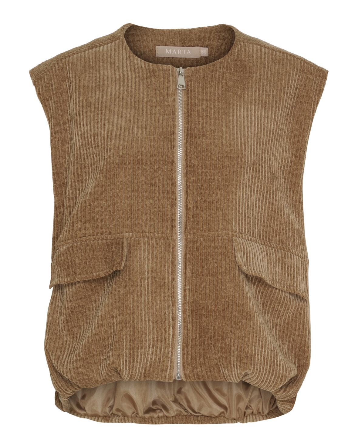 Vest 55009 fra Marta Du Chateau i camel. Smart vest i bred riflet fløjl, rund hals, lynlås ned foran og front lommer. Vesten har ballon fald forneden.