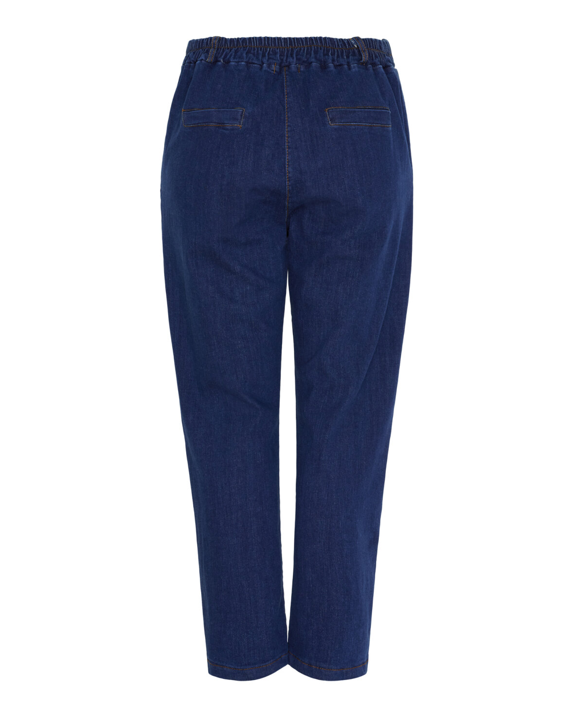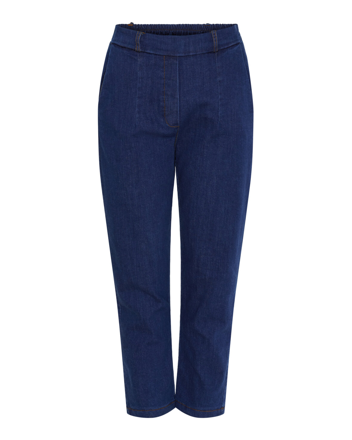 Buks 256422J fra Marta Du Chateau i medium blå. Lækreste og bløde buks med stretch, 7/8 længde, fast linning foran og elastik linning bagpå. Modellen er med skrålommer foran og snyde lommer bagpå og er lige til at trække op.