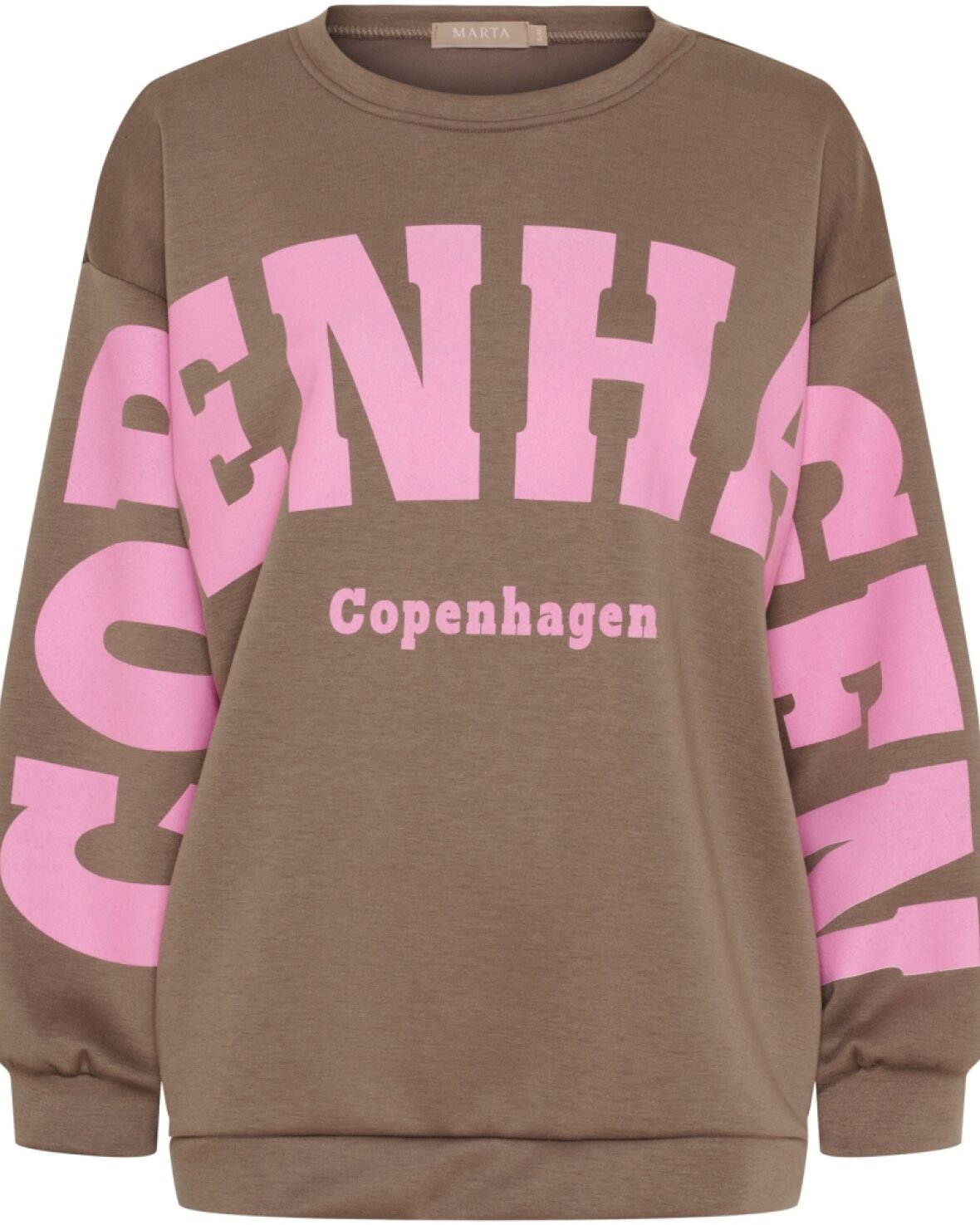 Sweatshirt 22659 fra Marta Du Chateau i fango. Blød og lækker sweatshirt med smart COPENHAGEN skrevet henover bryst og arme. Let oversize i størrelsen.