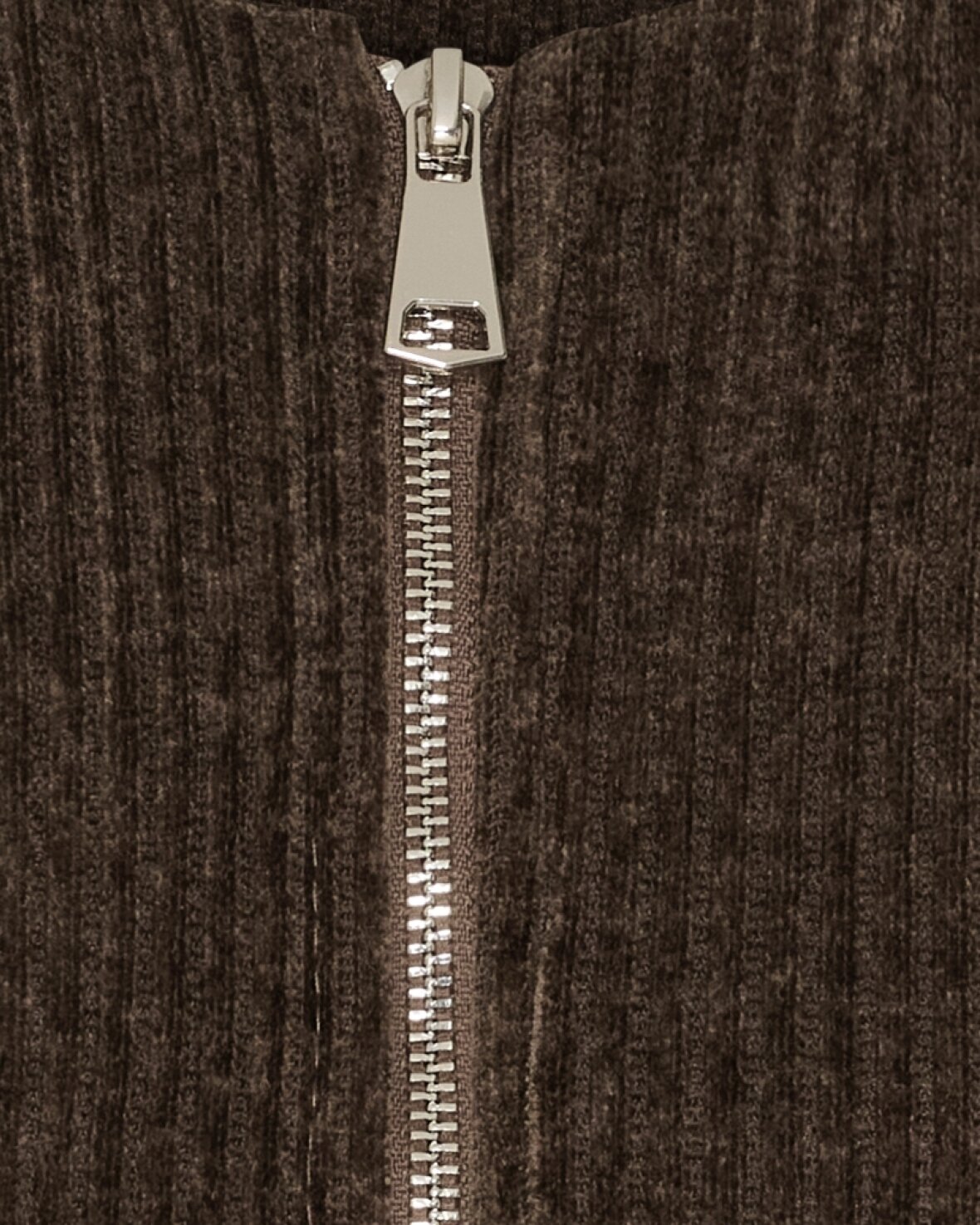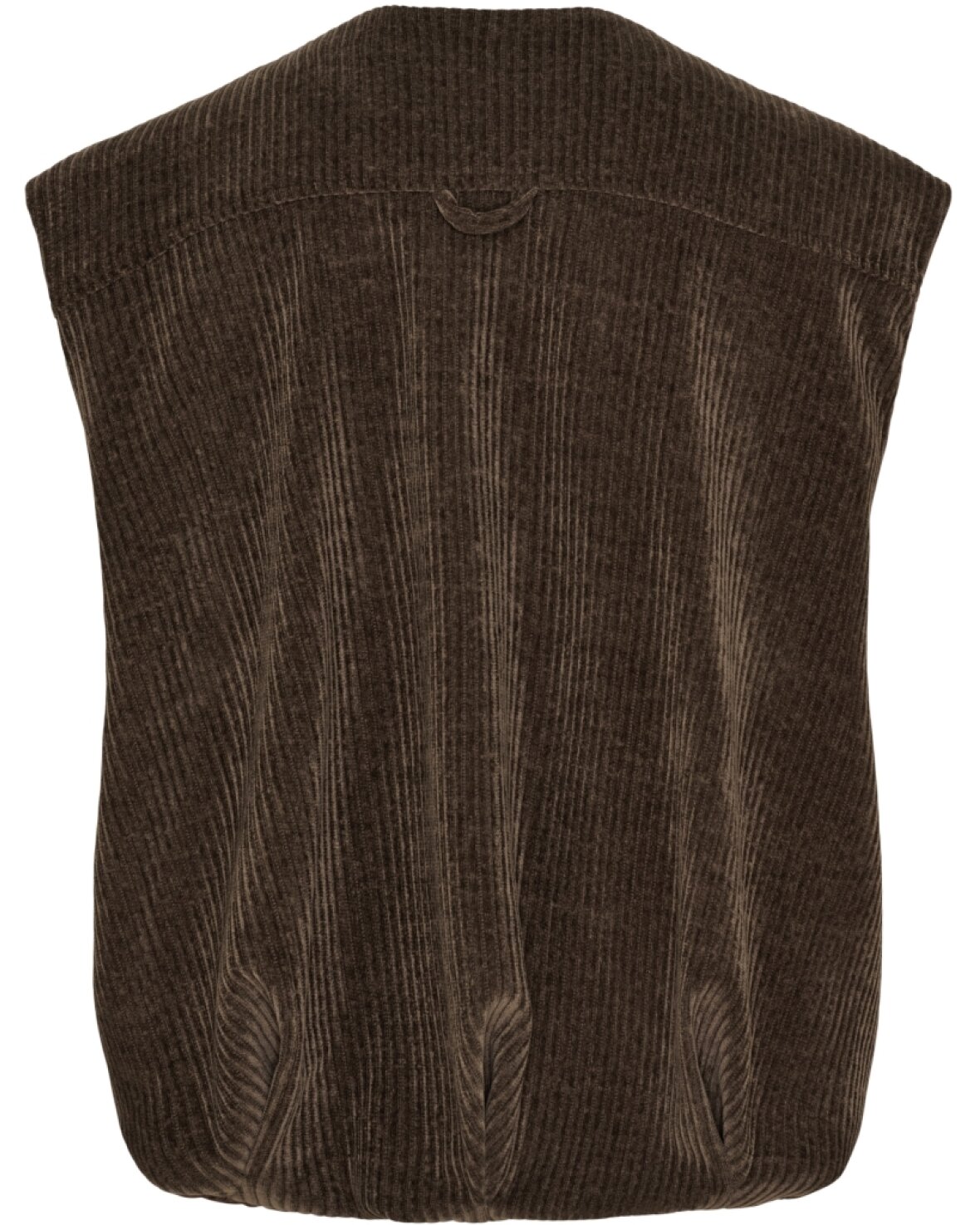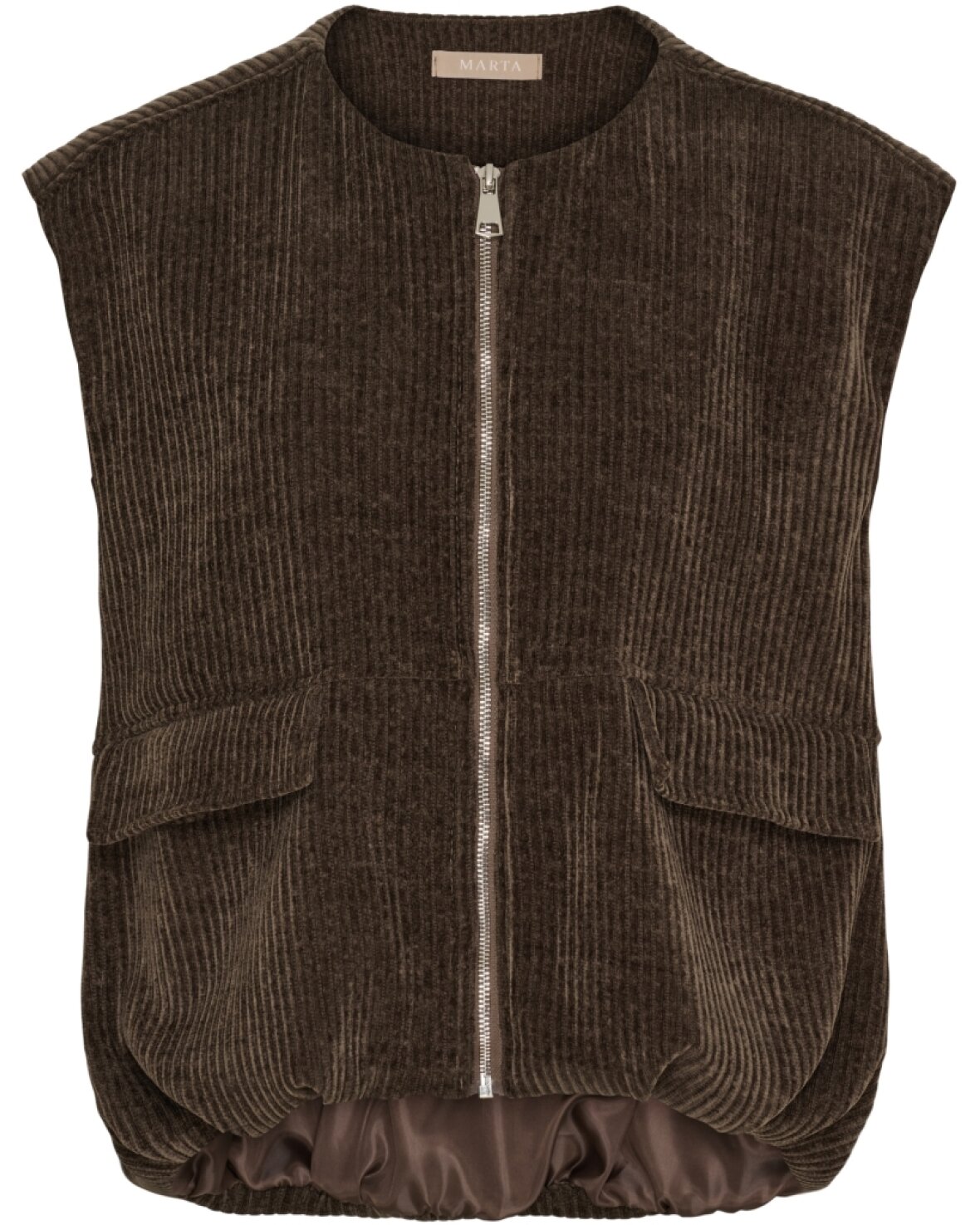 Vest 55009 fra Marta Du Chateau i brun. Smart vest i bred riflet fløjl, rund hals, lynlås ned foran og front lommer. Vesten har ballon fald forneden.