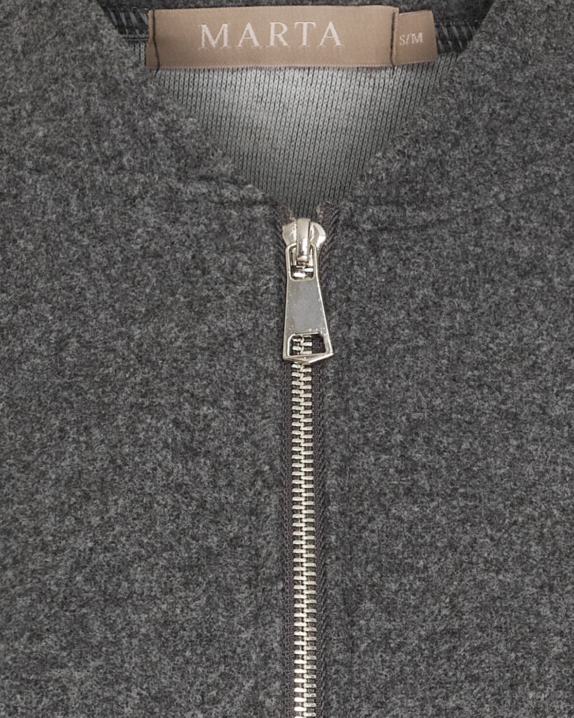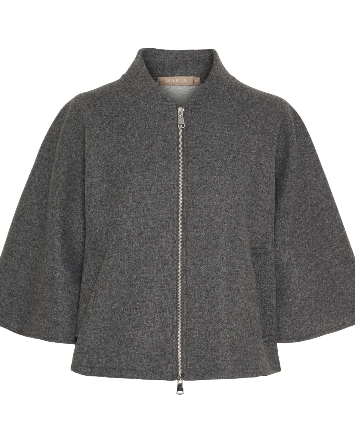 Jakke 55136 fra Marta Du Chateau i grå. Super flot kappe/jakke med kina krave, lynlås og 3/4 lange ærmer. Kan både bruges inde og ude.