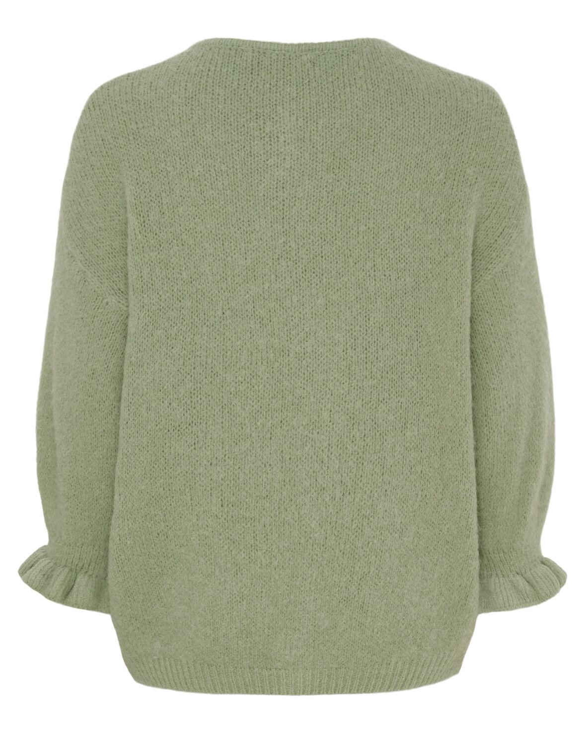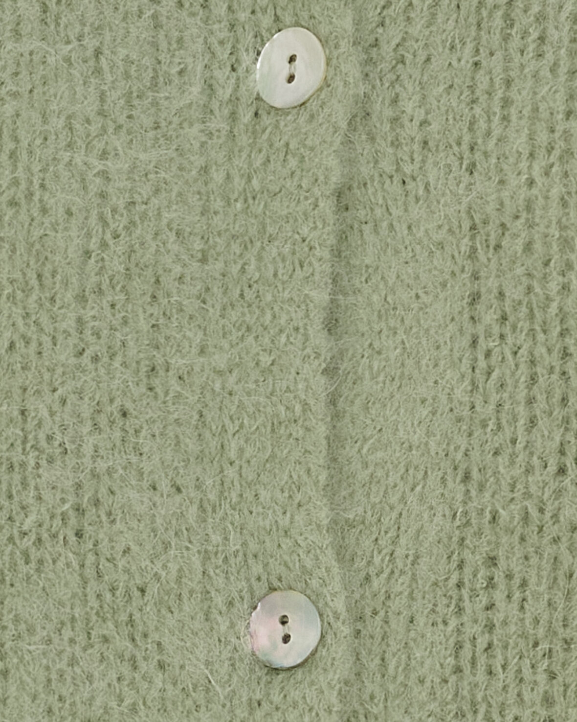 Strik 2413 fra Marta Du Chateau i salvia. Lækreste strik cardigan med rund hals, gennemknappet og 3/4 lange ærmer med fin "flæse" detalje